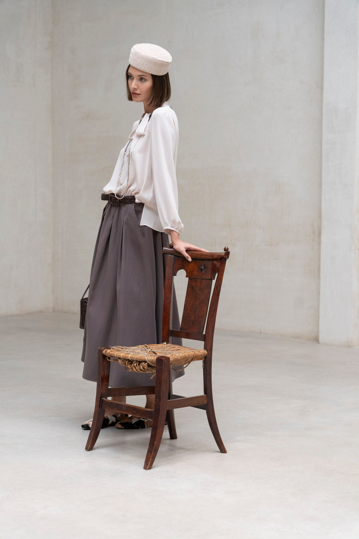 - Sombrero tipo casquete de inspiración retro, con silueta redondeada y acabado texturizado en color arena.