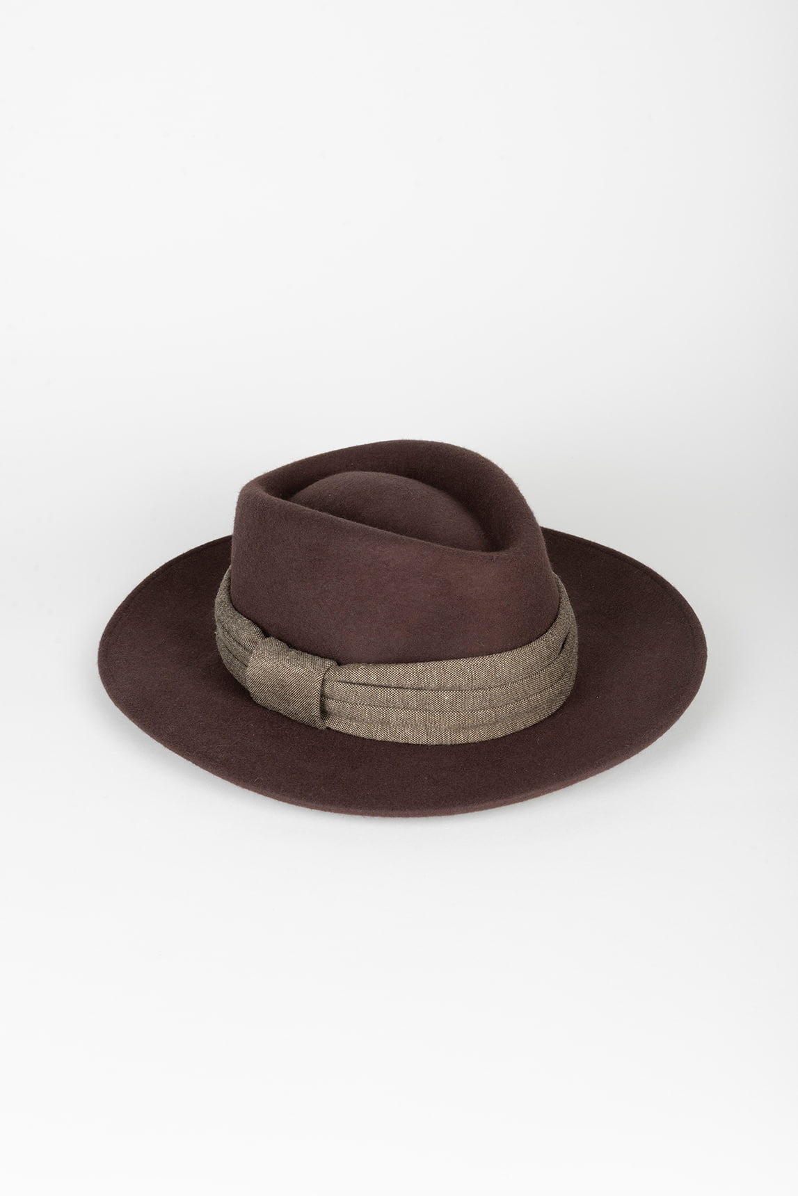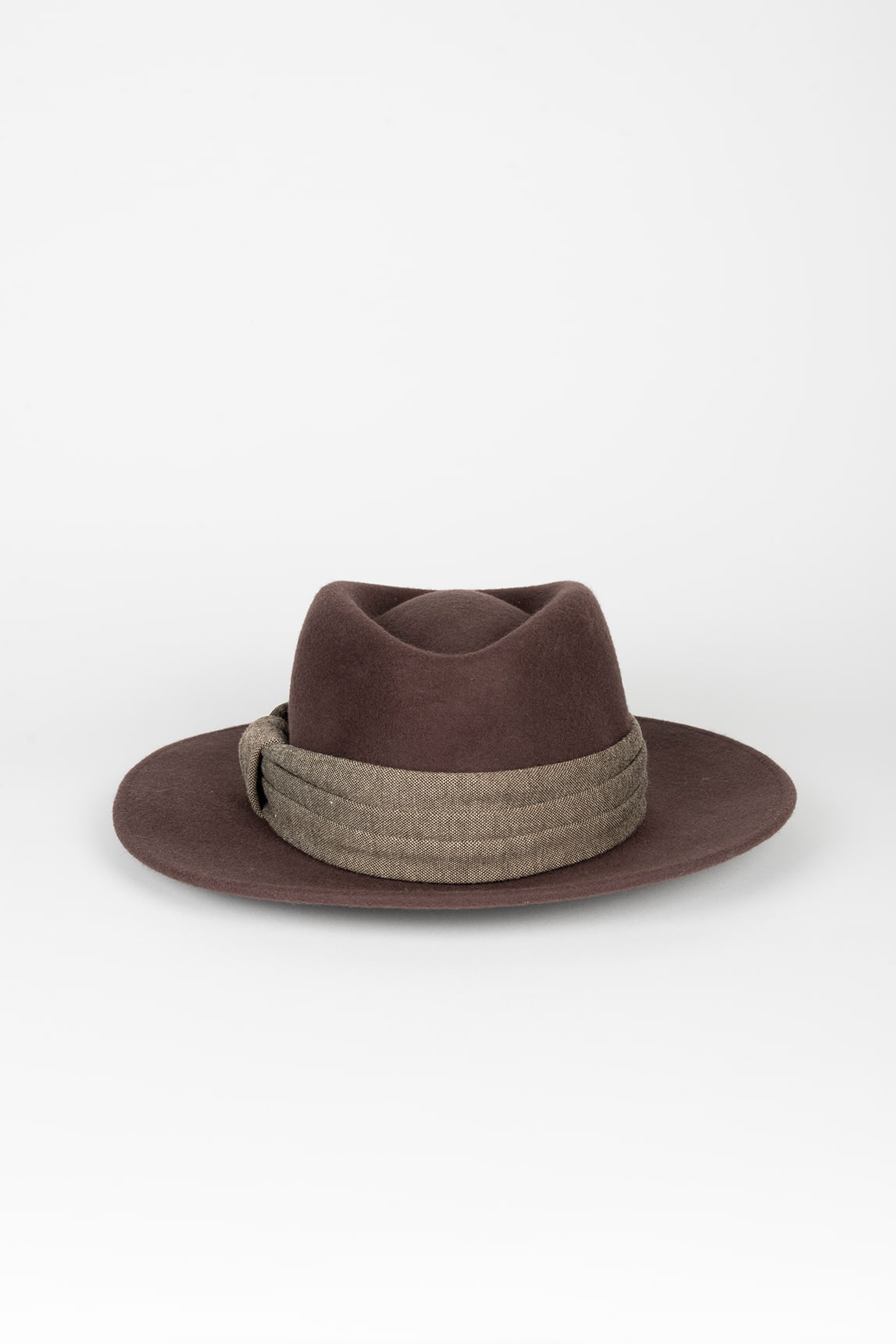 - Sombrero de fieltro con copa tipo fedora y ala media.