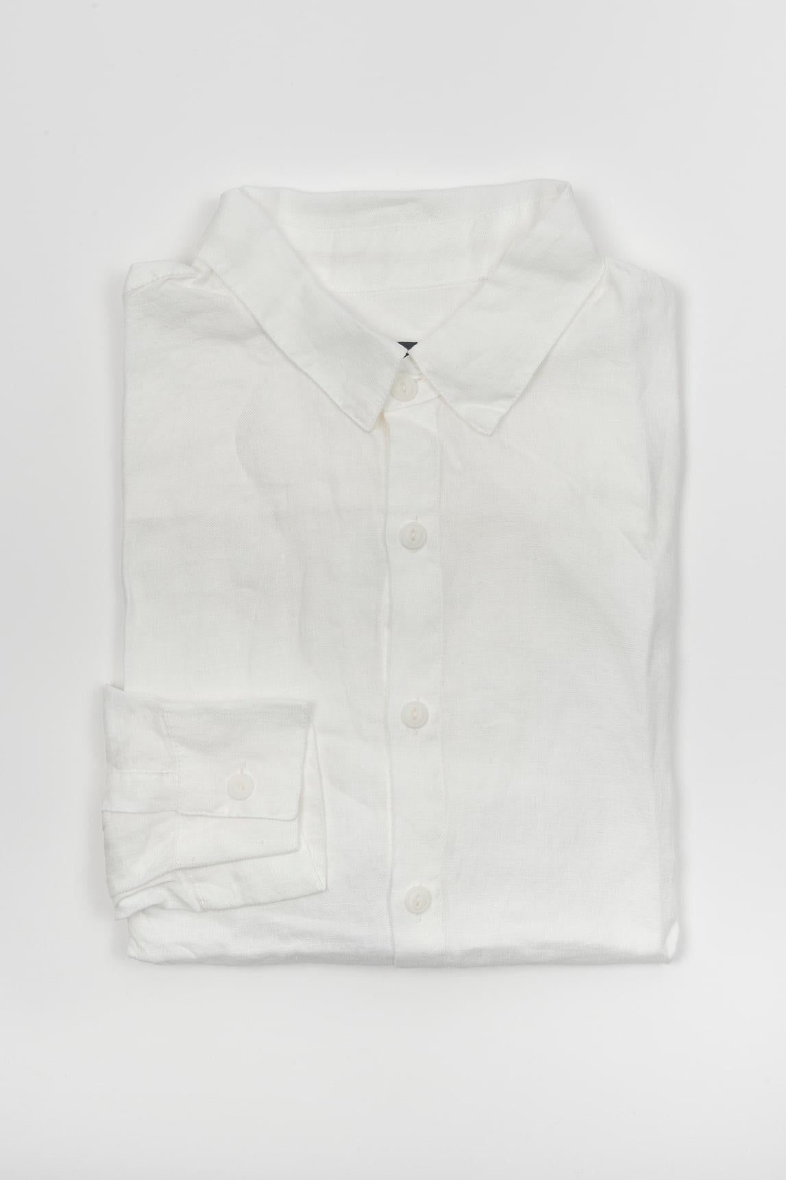 Men's long-sleeved shirt in white, with a straight silhouette and a clean, plain design. It features a classic collar, front white button fastening, and buttoned cuffs, creating a clean, bright, and very easy-to-wear image. The surface offers a soft visual texture that adds naturalness to the ensemble without altering its sober appearance, while the drape feels light and tidy.