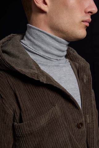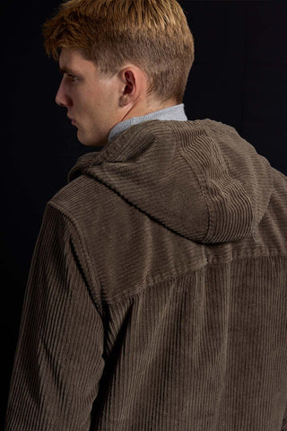 Esta pieza de Koike funciona como camisa gruesa o como sobrecamisa ligera. La pana de canalé y la capucha aportan un aire utilitario y muy actual que queda perfecto sobre camisetas, cuellos cisne o jerséis finos en looks casual de entretiempo.
