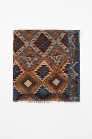 Discover Rivera's ethnic-inspired jacquard scarf in earthy, tan, and grayish-blue tones. Its geometric block print adds depth and personality without sacrificing visual warmth. A wraparound, comfortable, and versatile accessory for the colder months. Crafted from wool, it drapes naturally, while the frayed finish on the sides reinforces its handcrafted aesthetic. A practical piece for adding texture and contrast to neutral or monochrome fall and winter looks.