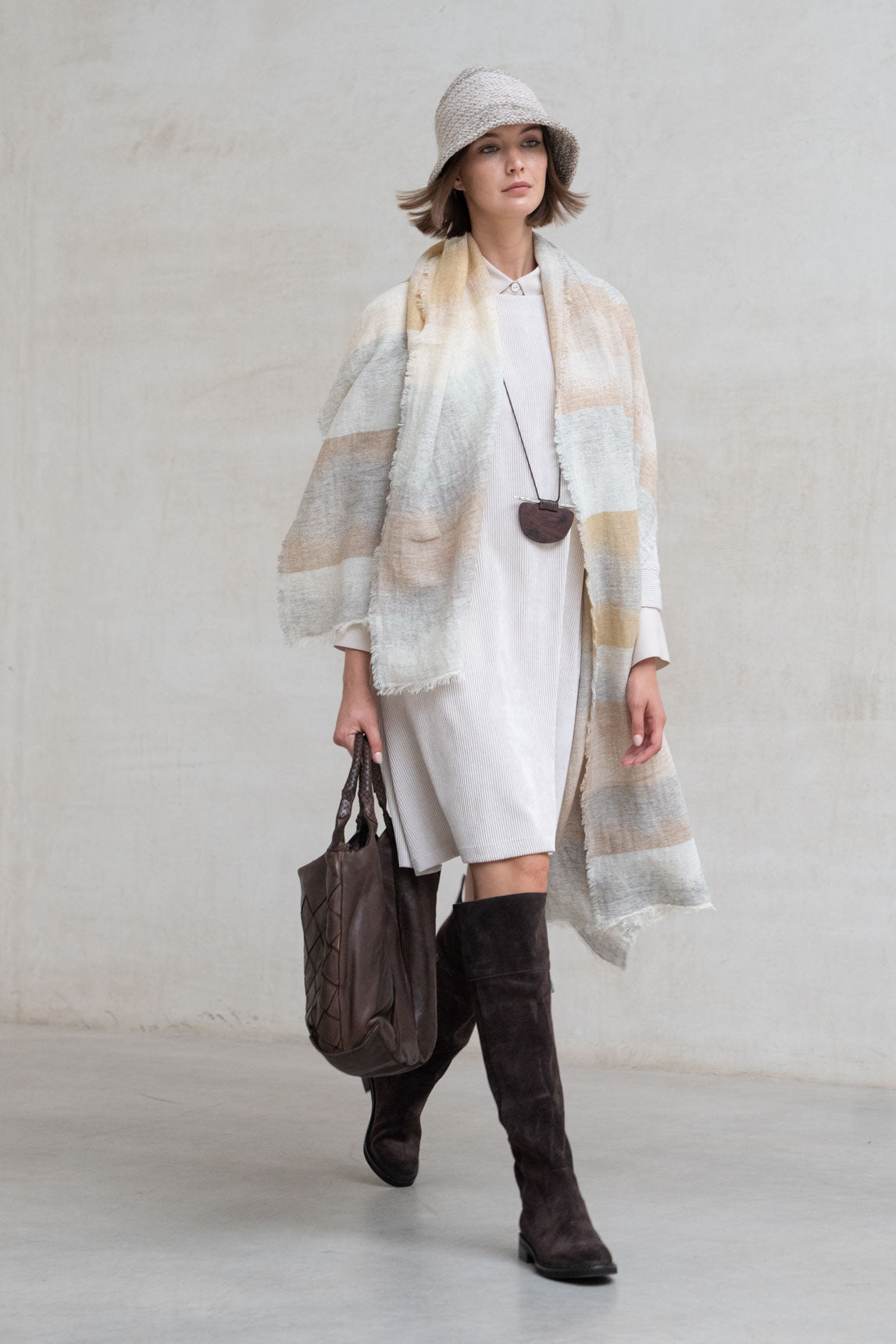 The Rivera scarf in neutral tones is a versatile and timeless piece that elegantly adapts to any style. Its diagonal stripes provide visual dynamism without losing the softness of its color palette. Ideal for elevating monochromatic or layered looks, its warm texture makes it a perfect accessory for fall and winter. The soft fringes at the ends add a delicate, handcrafted detail.
