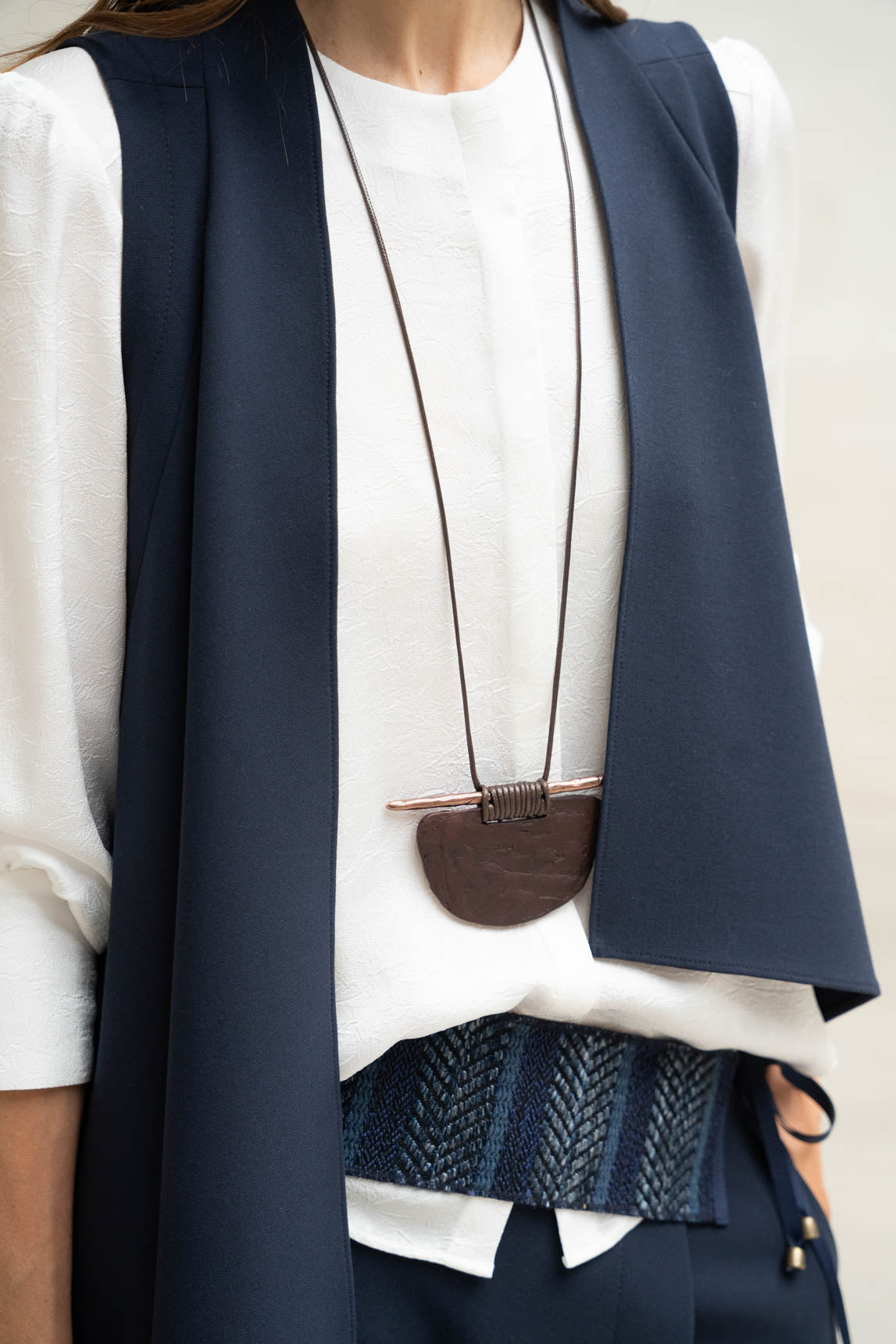This cummerbund is a must-have for the fall-winter season. With a herringbone pattern in navy blue, black, and grayish accents, it adds visual depth and texture to any look. The navy blue grosgrain ribbons with metallic trim allow for easy adjustment at the waist, enhancing the silhouette with an elegant touch. Its lined interior ensures comfort for everyday wear. Ideal for complementing coats, shirts, or dresses with a sophisticated and contemporary feel.