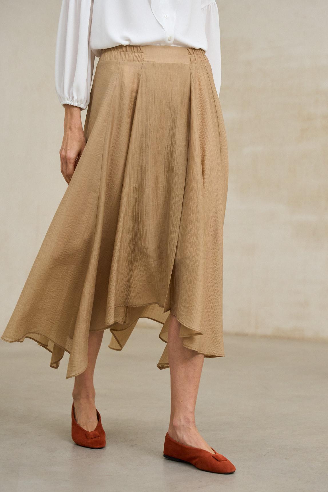Falda midi confeccionada en tejido ligero y fluido que aporta movimiento natural al caminar. Presenta cintura limpia y silueta evasé con bajo ligeramente asimétrico, creando una caída elegante y dinámica que estiliza la figura sin marcar. La Falda Nadeya camel destaca por su versatilidad y su estética sofisticada. Su tono neutro cálido permite combinarla fácilmente con blusas ligeras, camisetas básicas o chaquetas estructuradas, adaptándose tanto a looks de oficina como a estilismos más relajados de primavera y verano. Su diseño atemporal la convierte en una pieza clave de fondo de armario, perfecta para crear conjuntos femeninos, equilibrados y con movimiento. Nos esforzamos por mostrar los colores de la forma más fiel posible, pero pueden variar ligeramente respecto a la realidad.