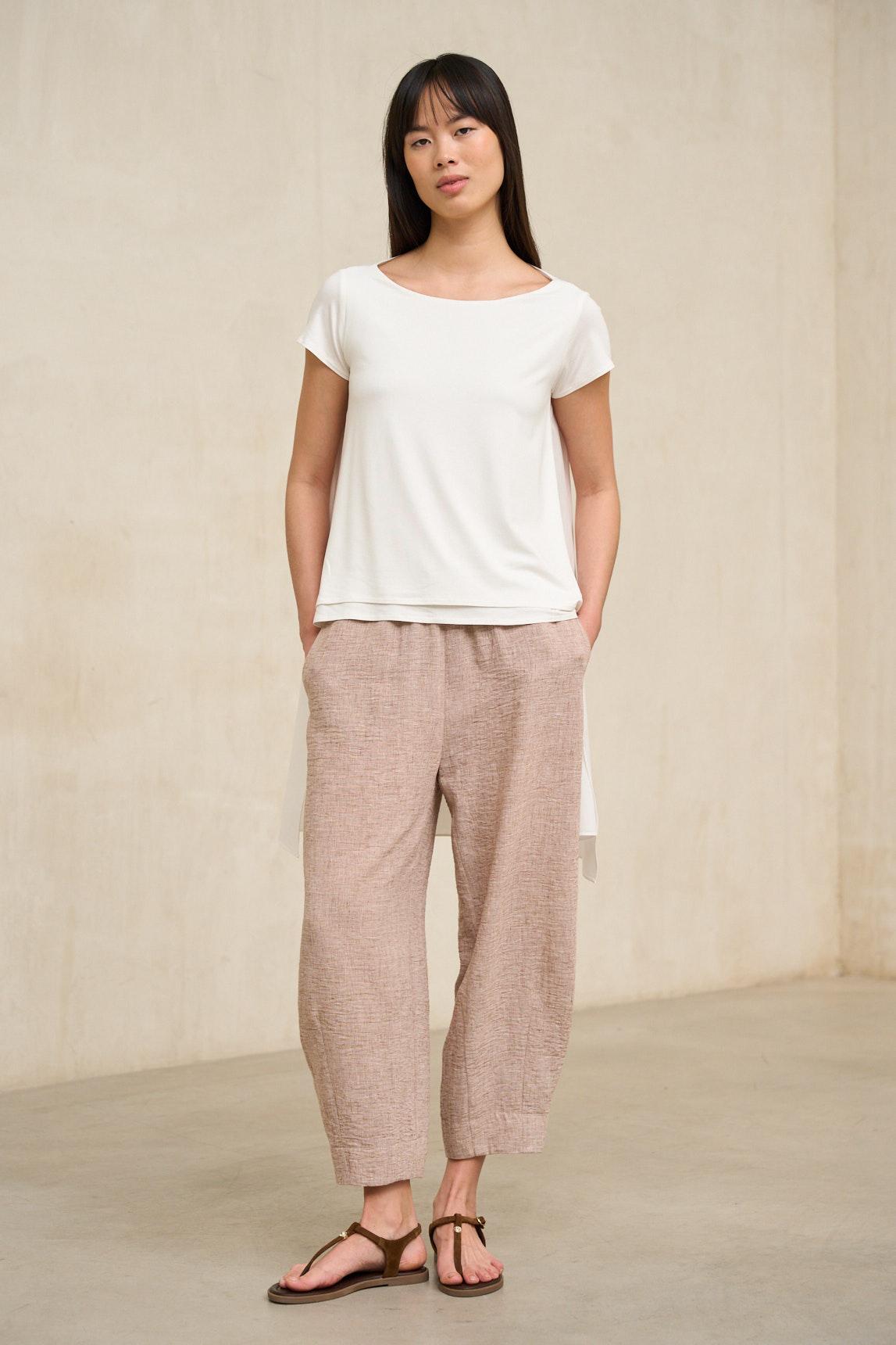 La camiseta Arnel blanco roto es una prenda esencial de líneas depuradas que combina sencillez y elegancia natural. Confeccionada en tejido suave y ligero, presenta una silueta recta con caída fluida que se adapta al cuerpo sin marcar, aportando comodidad y equilibrio visual. Su diseño incorpora escote redondo limpio y manga corta ligeramente suelta, creando una proporción armónica y fácil de llevar. La parte trasera es ligeramente más larga que el delantero, un detalle sutil que estiliza la silueta y aporta movimiento al conjunto.