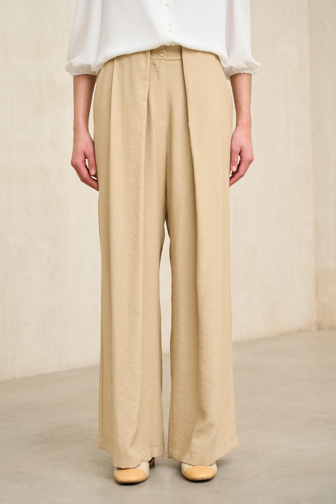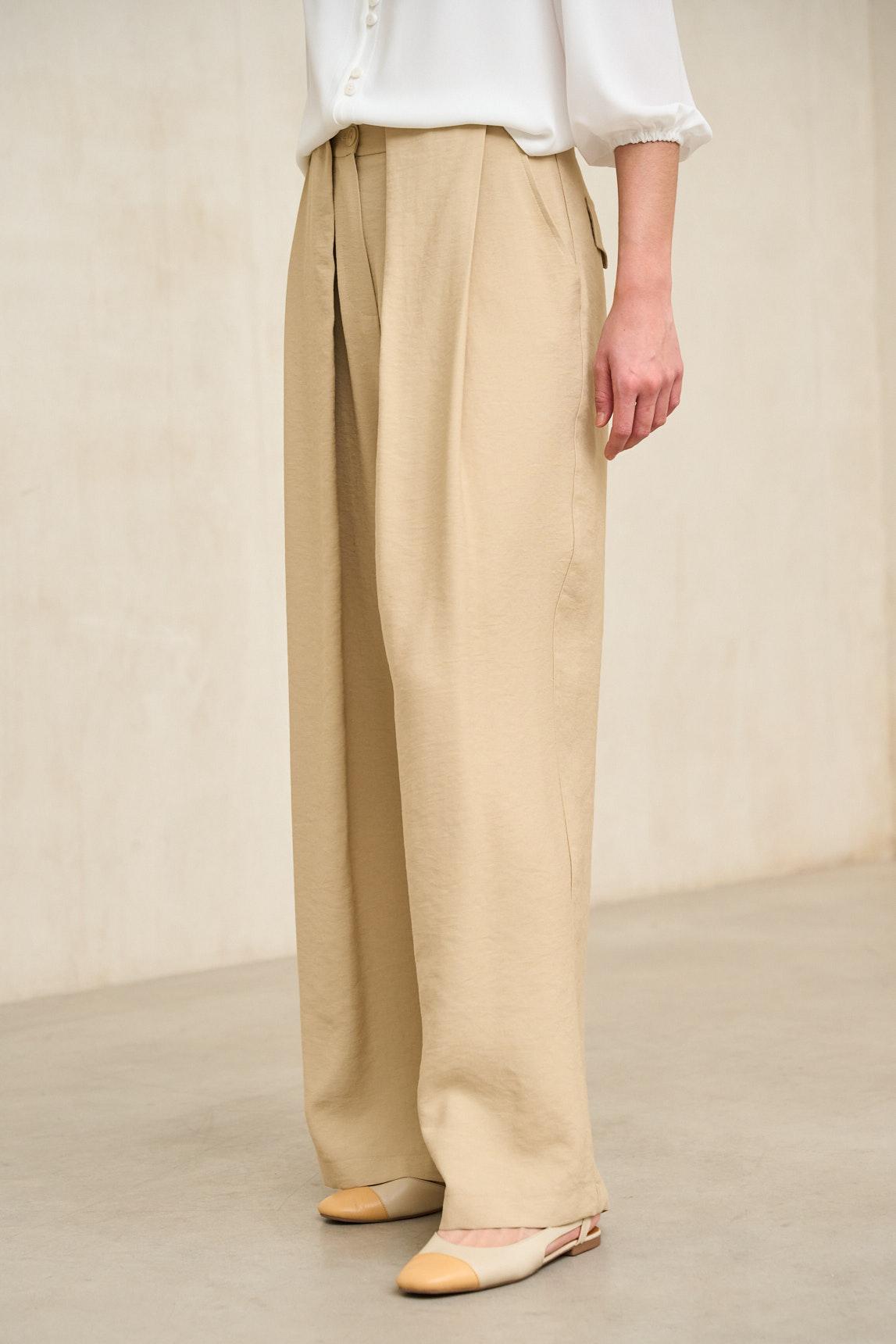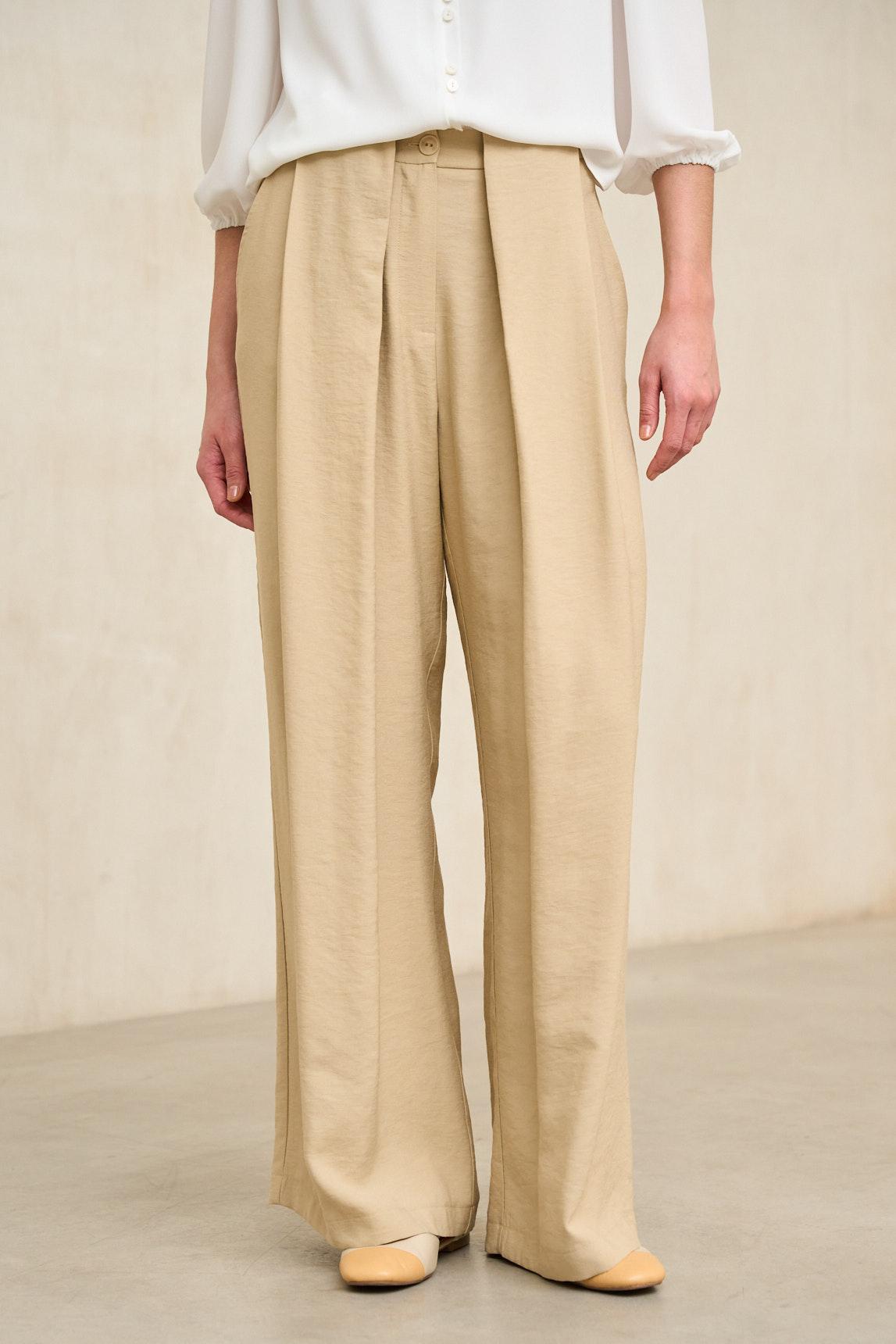 Este pantalón mantiene la silueta amplia y recta característica del modelo, estructurada mediante pinzas frontales profundas que generan volumen desde la cintura y una caída fluida y continua. Presenta cierre frontal con botón visible y un tejido ligero con textura arrugada vertical, que aporta dinamismo visual y un acabado natural al diseño. La pernera larga estiliza la figura y refuerza su línea relajada.