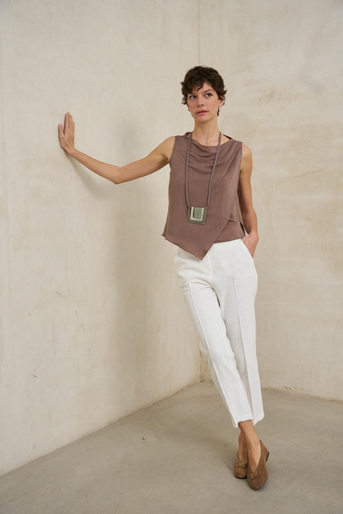 Presenta escote suavemente drapeado que aporta movimiento y un aire elegante sin resultar excesivo. El diseño sin mangas estiliza la figura y lo convierte en una opción ideal para los días cálidos o para combinar bajo chaquetas ligeras y blazers.
