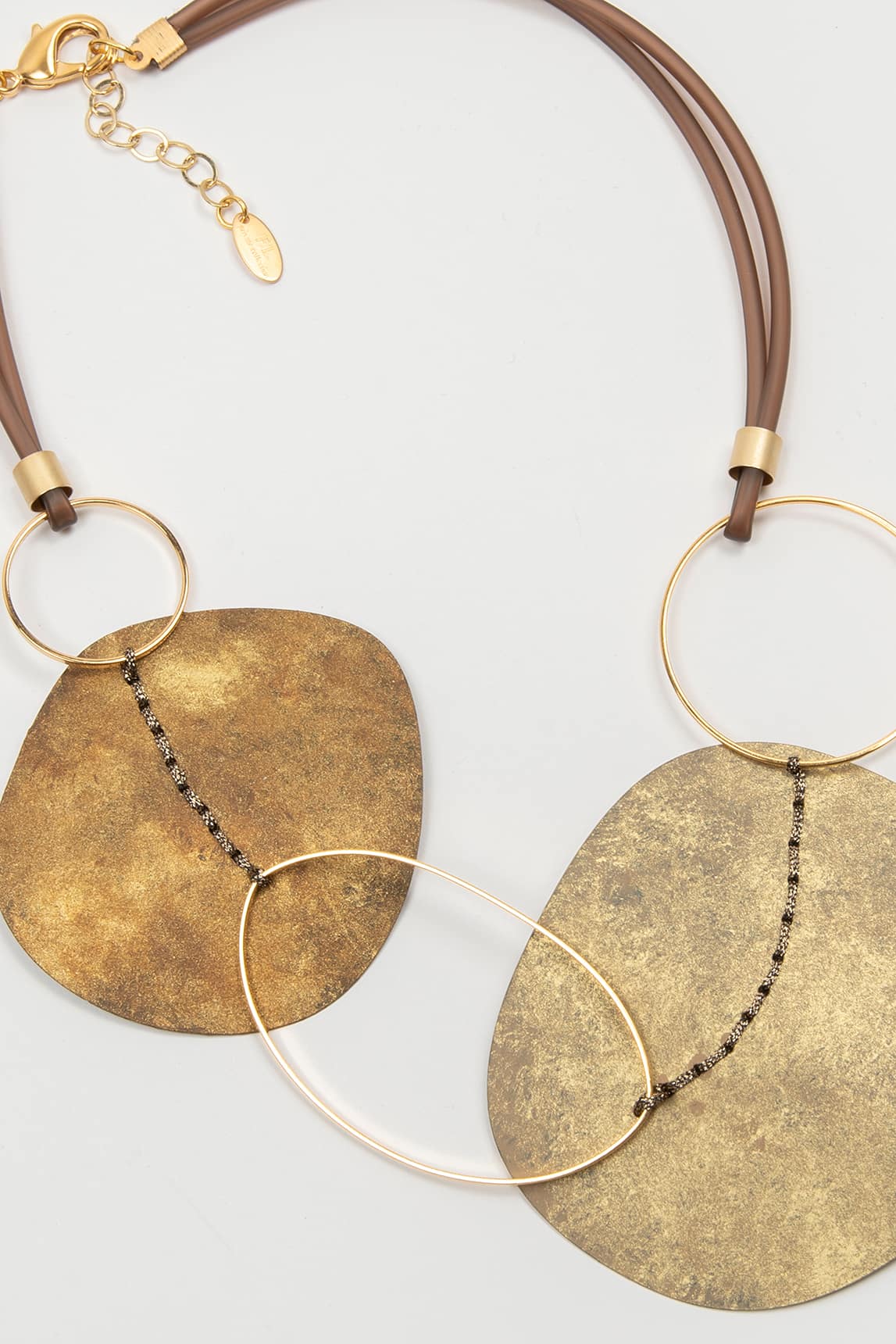 This short necklace combines organic and geometric shapes with great visual balance. Two irregular pieces of antiqued brass intertwine with lightweight gold hoops, joined by a black chain that adds texture and contrast. The design is completed with two satin-finished brown tubes that wrap around the neck with strength and elegance.