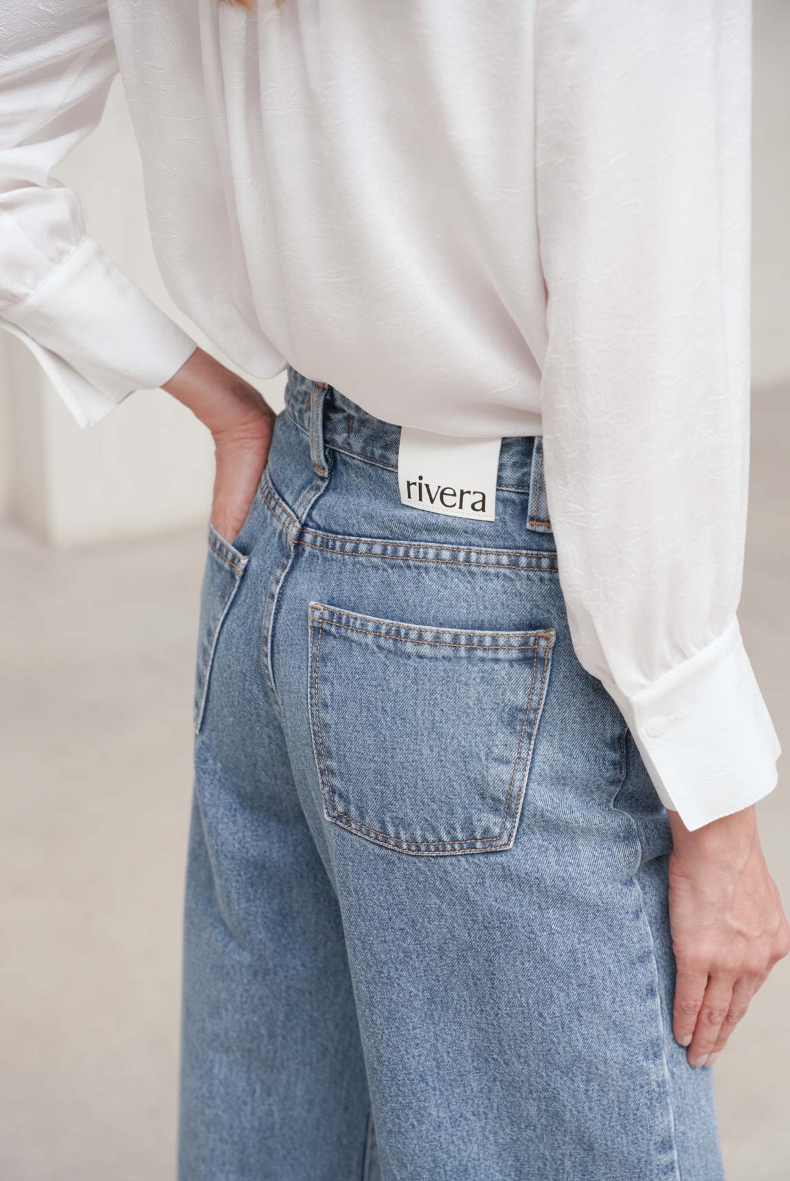 The Evoque denim pant is Rivera's first jean, designed with sustainability in mind and featuring the brand's defining style. Made with certified recycled fabrics and sustainable fibers, this straight-cut, classic silhouette is a fail-safe piece that combines comfort, durability, and a commitment to the environment. Its medium wash and thoughtful details make it a contemporary staple for any wardrobe.