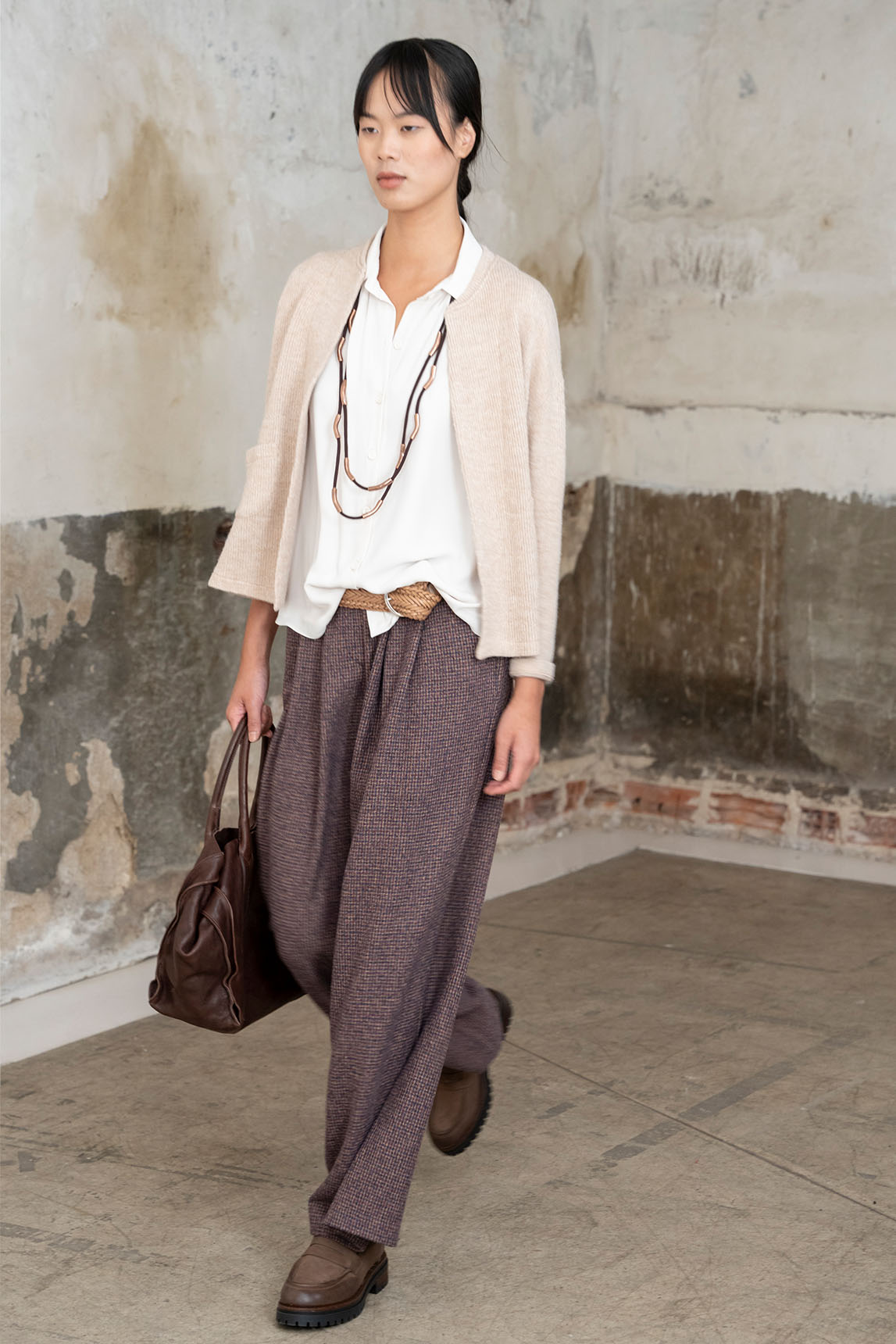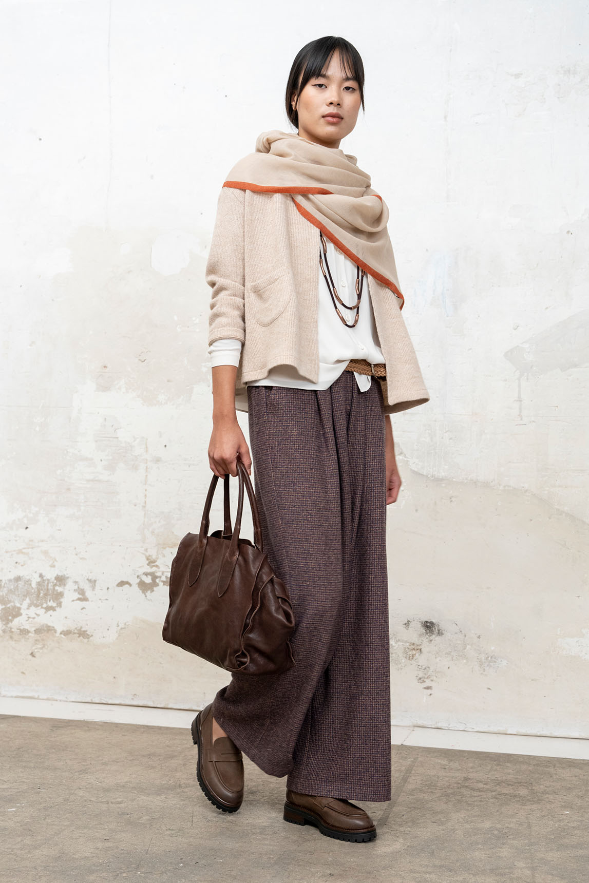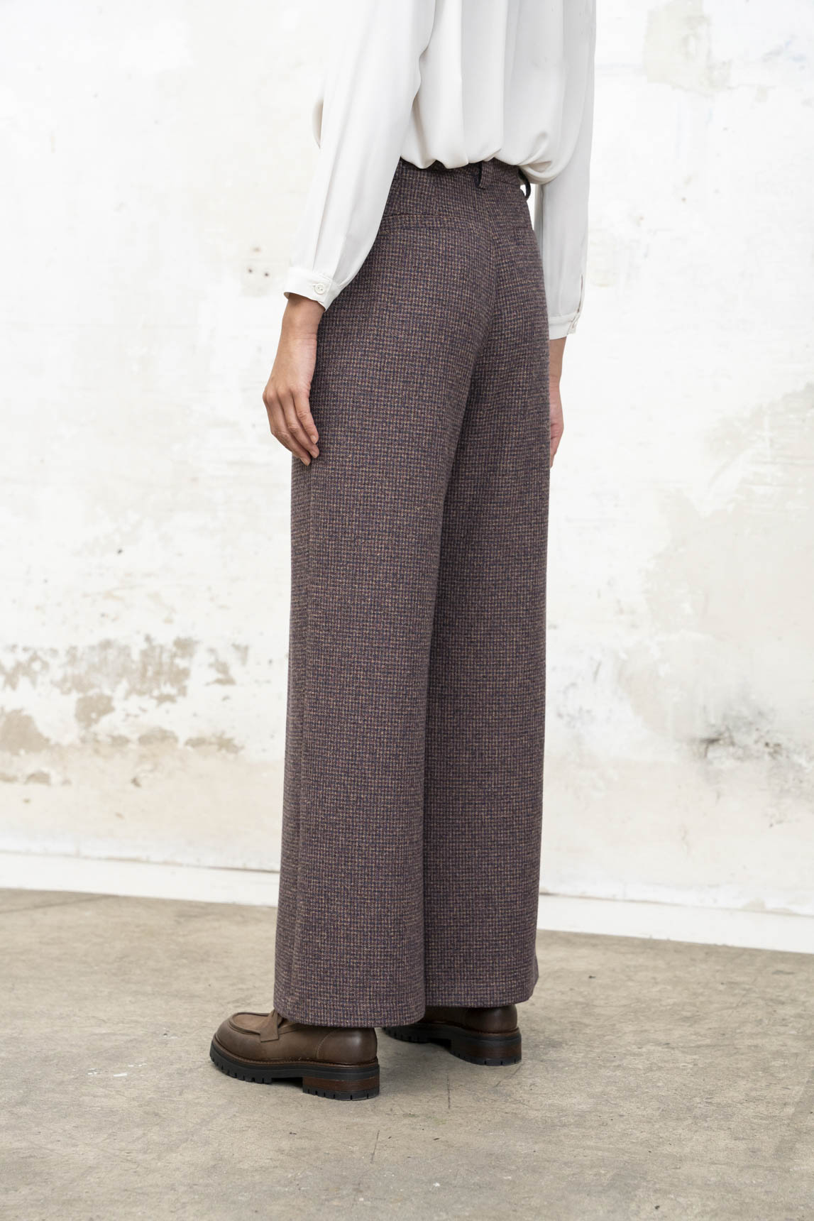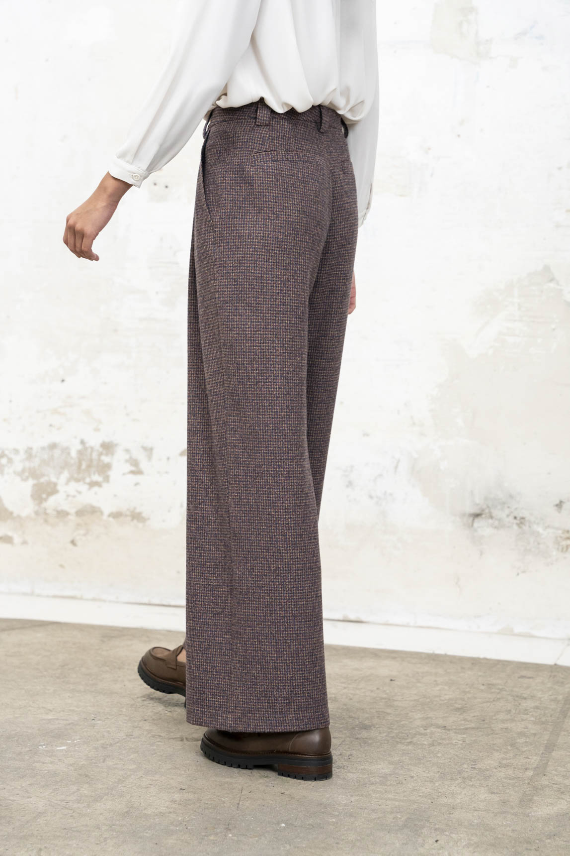 Discover the Aretha trousers from Rivera, a key piece for this season. Made from soft and elegant corduroy, its burgundy checkered design adds a touch of distinction and style. The wide legs and pleats ensure a comfortable and flattering fit, perfect for autumn and winter days. These versatile trousers adapt to both formal and casual looks, becoming a must-have in your wardrobe.