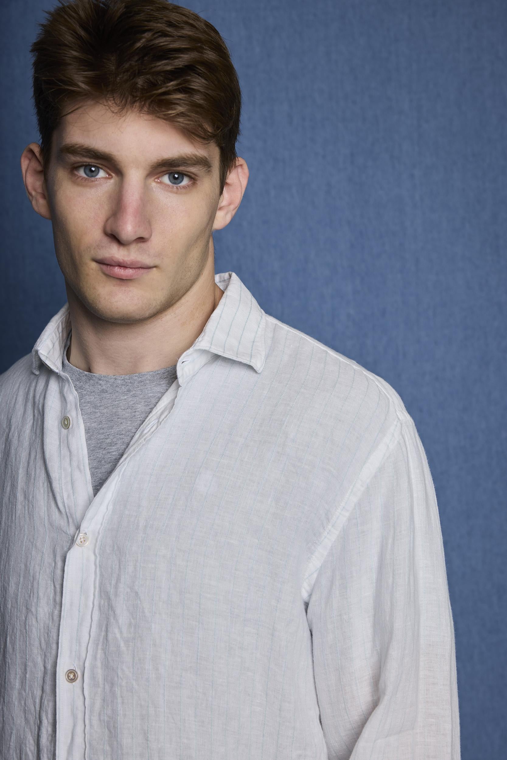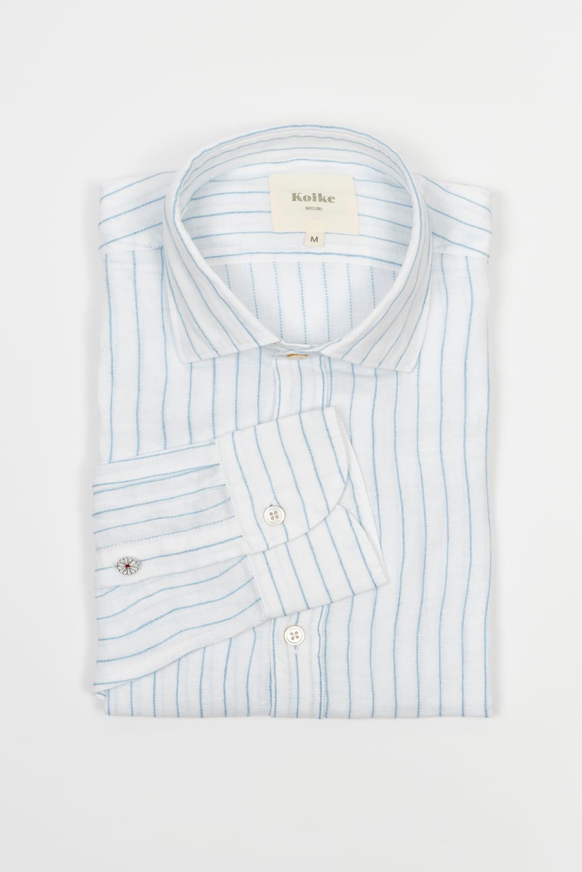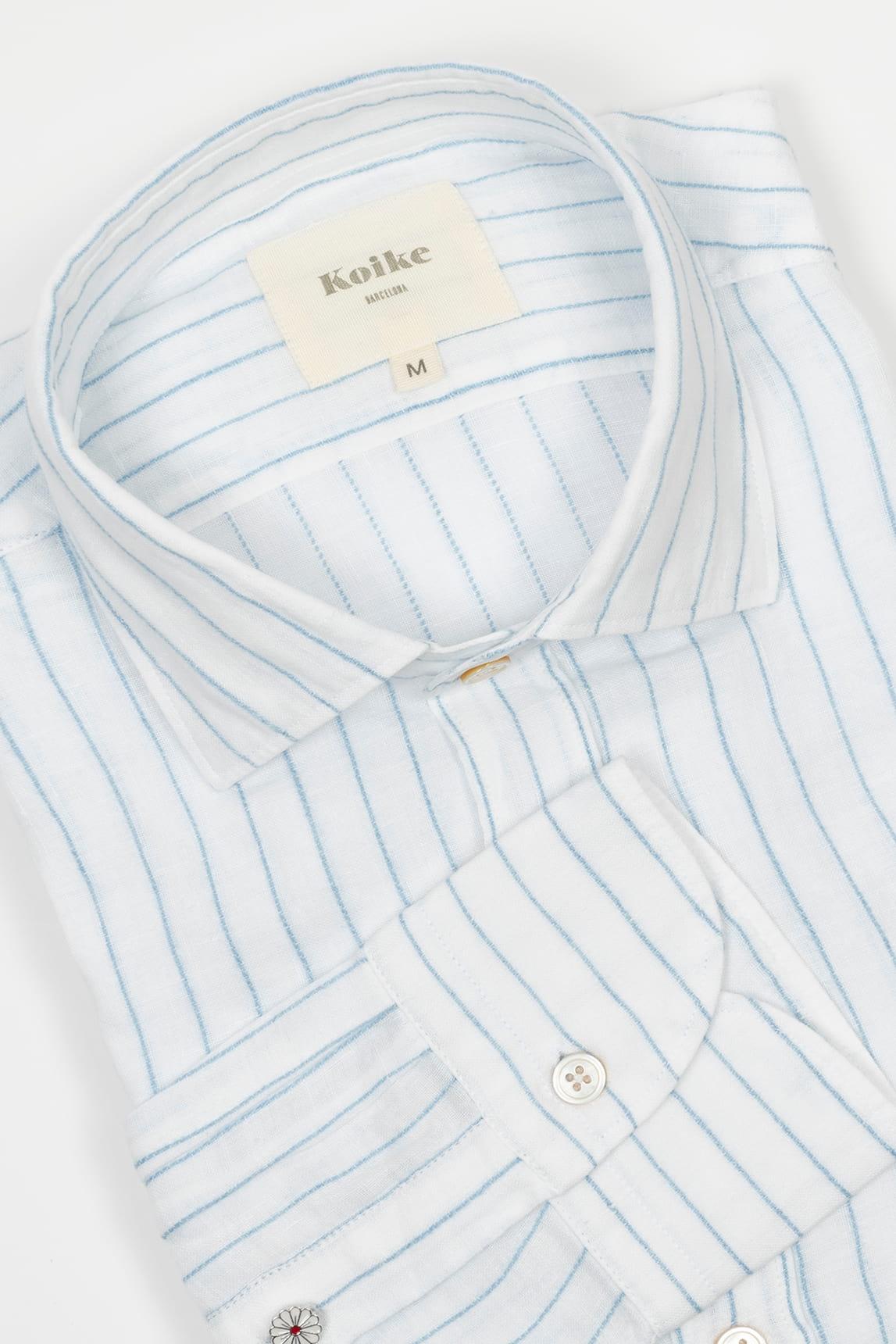 Camisa de hombre en color blanco con raya vertical en azul suave, silueta recta y cuello clásico. El diseño presenta cierre frontal de botones vistos, manga larga y puño abotonado, manteniendo una imagen limpia, luminosa y equilibrada. La raya fina aporta dinamismo visual y refuerza una estética atemporal, muy fácil de integrar en estilismos cuidados.