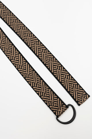- Cinturón con estampado geométrico en tonos beige y negro.