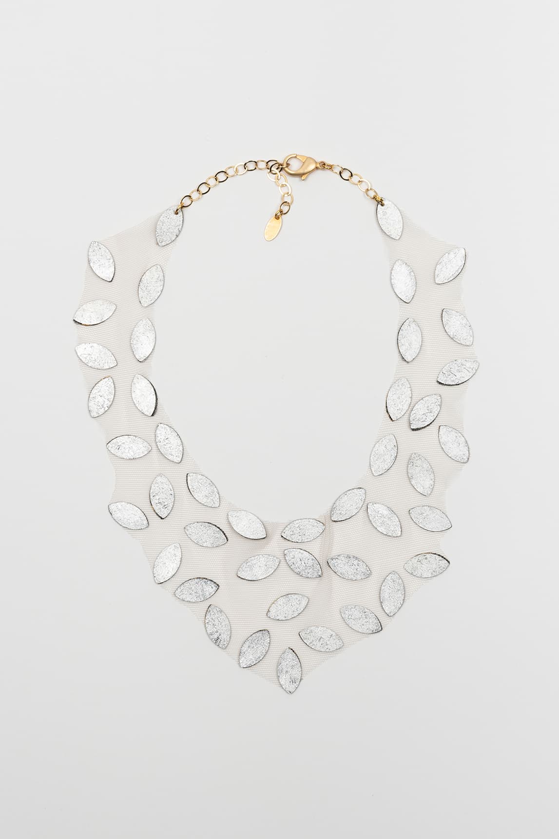 Collar tipo babero confeccionado sobre base de tul semitransparente en tono marfil, ligero y flexible. Está decorado con múltiples apliques metálicos en forma de hoja (almendrada) en acabado dorado texturizado, distribuidos por toda la pieza para crear un efecto de mosaico. Su diseño reversible permite llevarlo por un lado en acabado dorado y por el otro en acabado plateado, adaptándose fácilmente a distintos looks y estilos. Cierre superior con cadena extensible y mosquetón para ajustar al cuello.