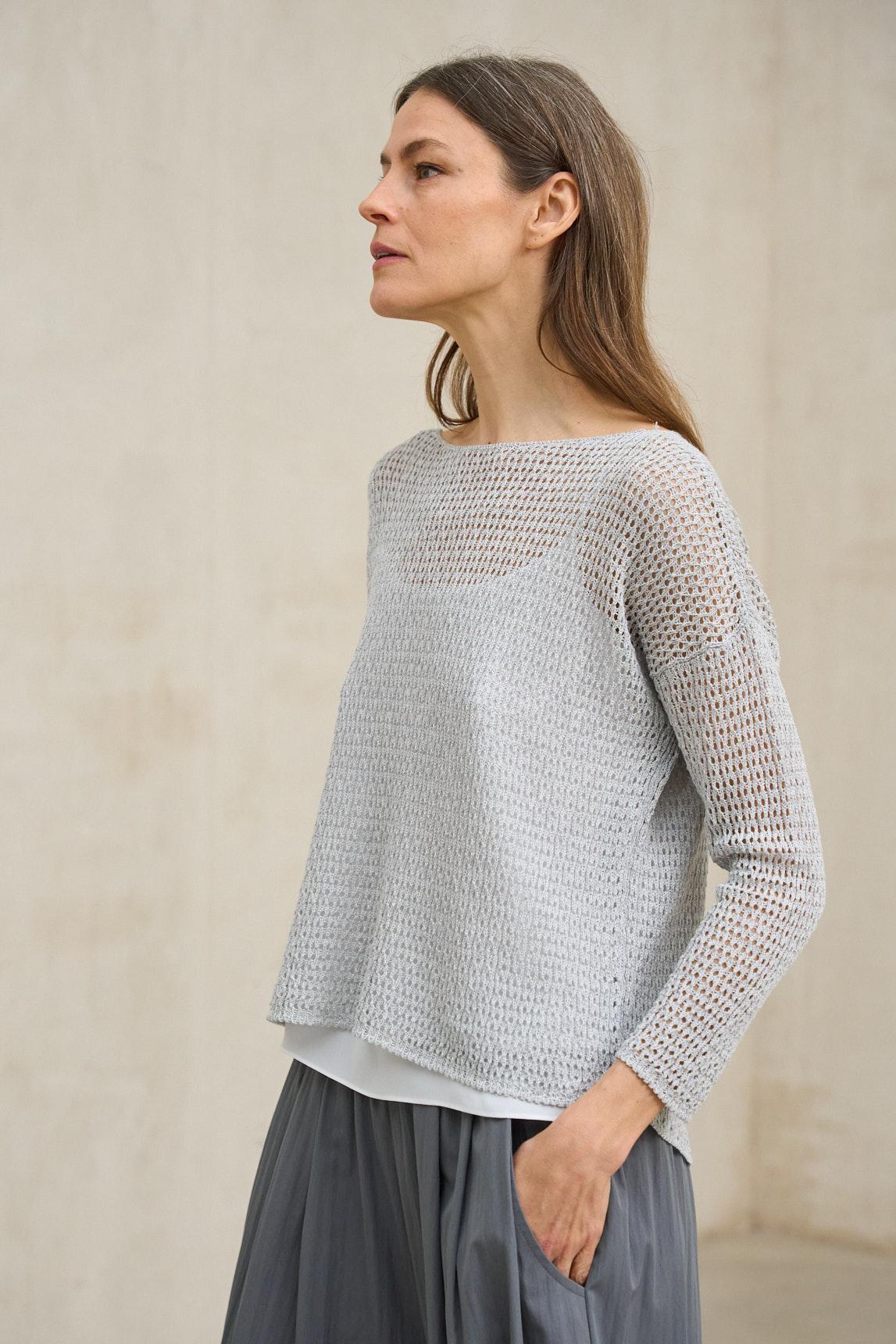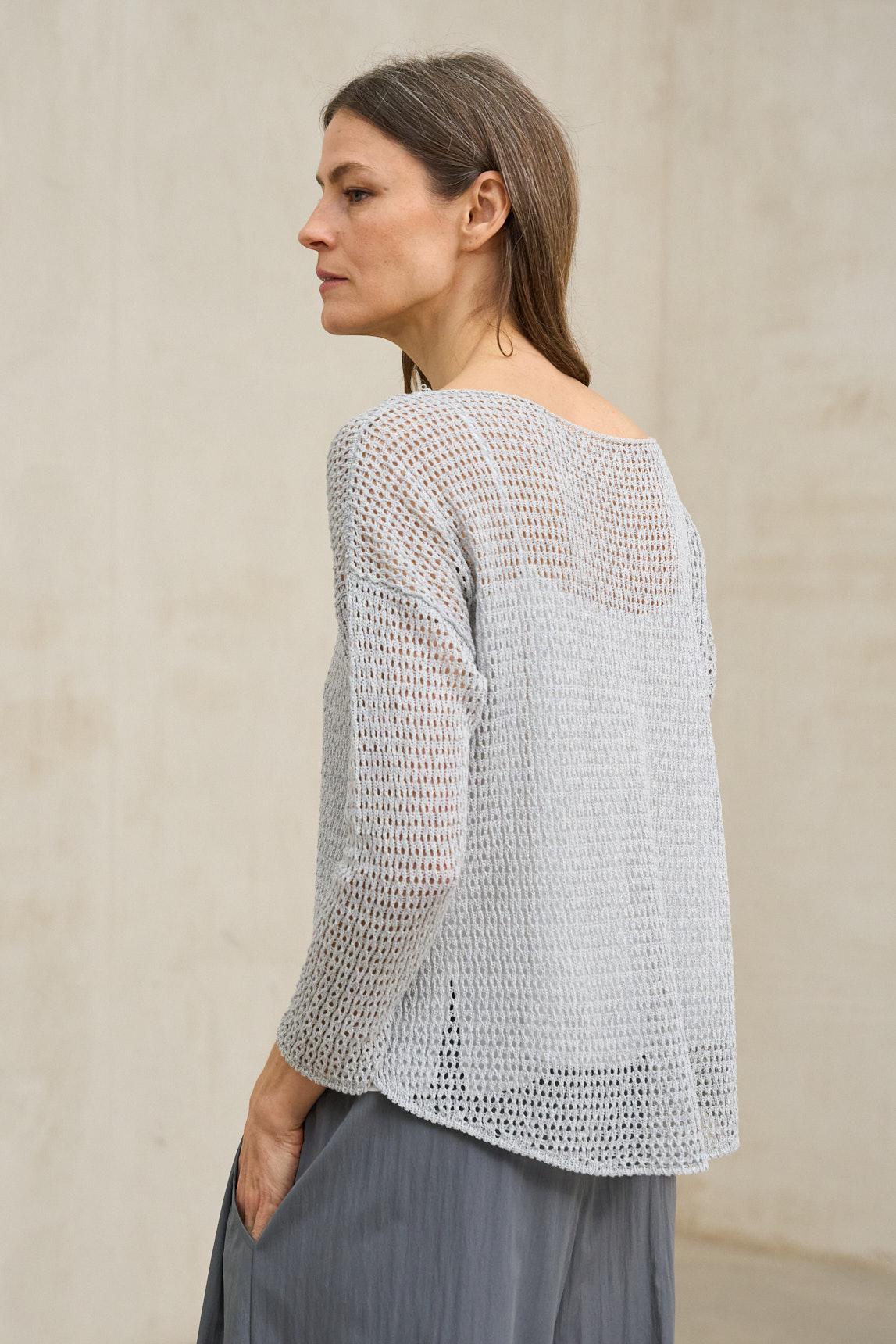 El jersey Lúvena gris azulado destaca por su ligereza y su delicada textura calada en la parte superior, que aporta un detalle sutil sin perder minimalismo. Su punto fino es ligeramente translúcido, por lo que se recomienda combinarlo con una camiseta interior o top básico (no incluido).