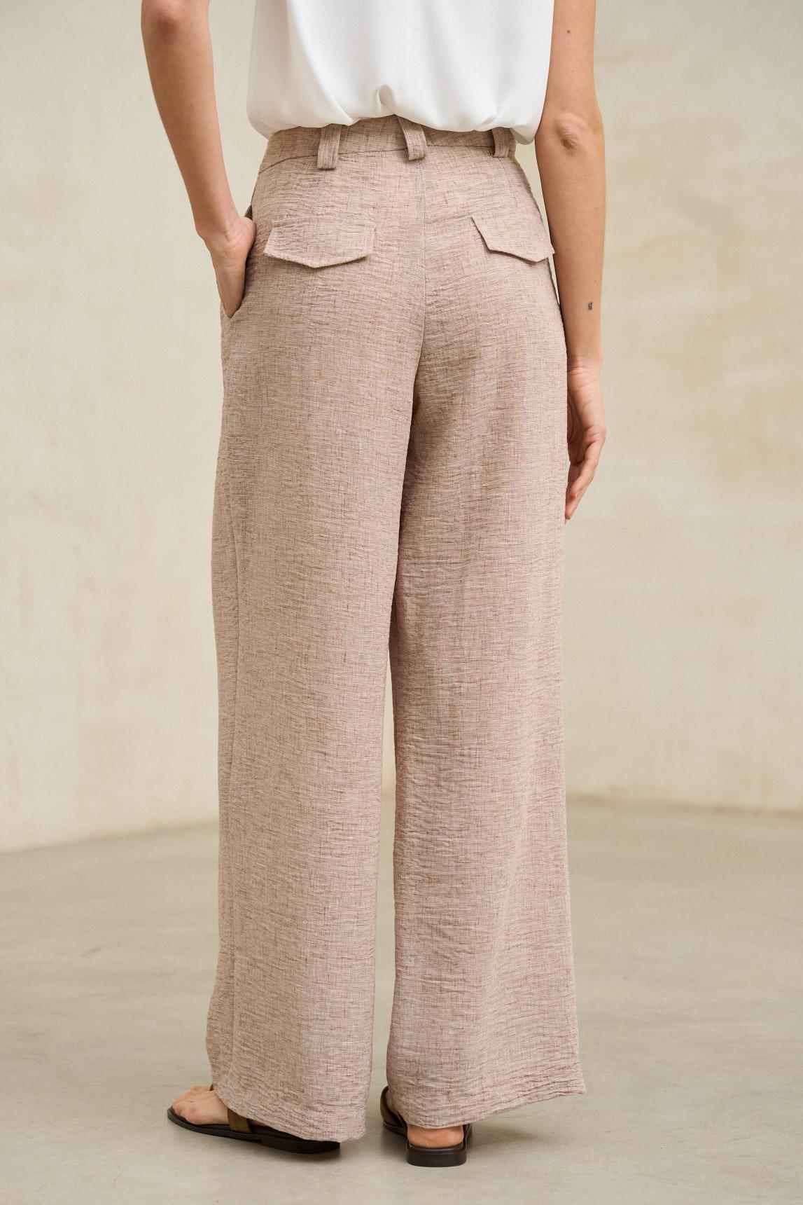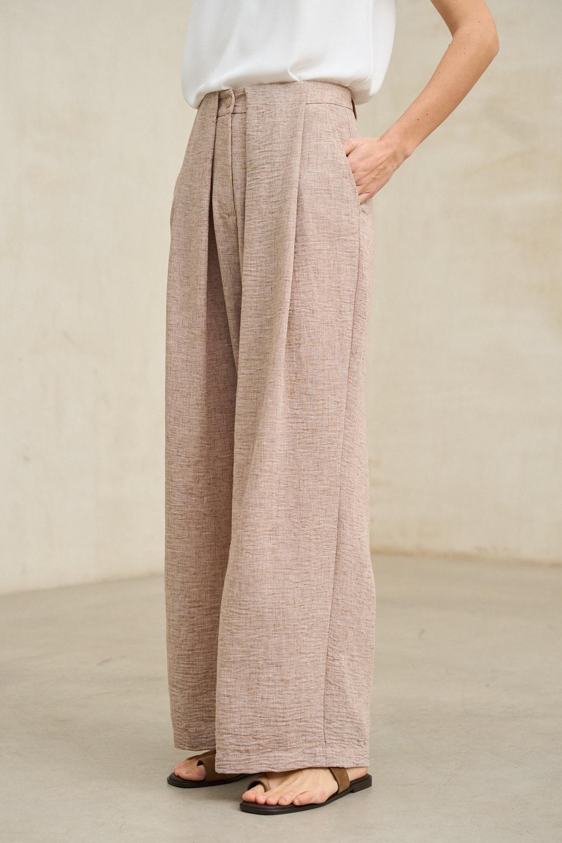 Este pantalón destaca por su silueta amplia y fluida, construida a partir de pinzas frontales que aportan estructura suave y volumen controlado. El cierre frontal con botón visible mantiene una estética limpia, mientras que la pernera larga y recta refuerza la sensación de ligereza. El tejido presenta una textura arrugada visible y uniforme, que añade profundidad visual y un acabado natural a toda la prenda. En clave de estilo, es una pieza de inspiración relajada con un punto elegante. Su fit amplio permite integrarlo fácilmente tanto en conjuntos más cuidados como en estilismos cotidianos, combinando con camisas ligeras, tops sencillos o prendas de punto fino. El color arena aporta luminosidad y suavidad, funcionando como base neutra para combinar con blancos, tonos tierra o contrastes más definidos. Diseñado para acompañar distintos momentos del día, este pantalón aporta confort y sensación de amplitud. Se lleva con naturalidad y se convierte en una base versátil para construir looks serenos, frescos y atemporales. Nos esforzamos por mostrar los colores de la forma más fiel posible, pero pueden variar ligeramente respecto a la realidad.