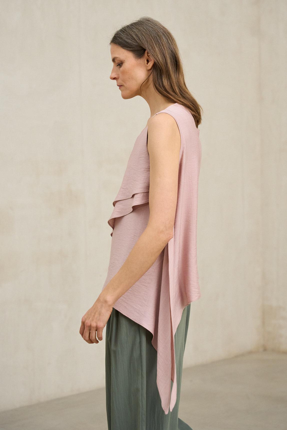 Con escote redondeado y hombros al aire, esta blusa sin mangas destaca por su textura sutilmente arrugada y un volante frontal en capas que recorre el pecho con caída ligera. La silueta se ve fluida y asimétrica, con un bajo irregular que aporta movimiento, y se aprecia una abertura trasera con cierre discreto que mantiene la línea limpia.