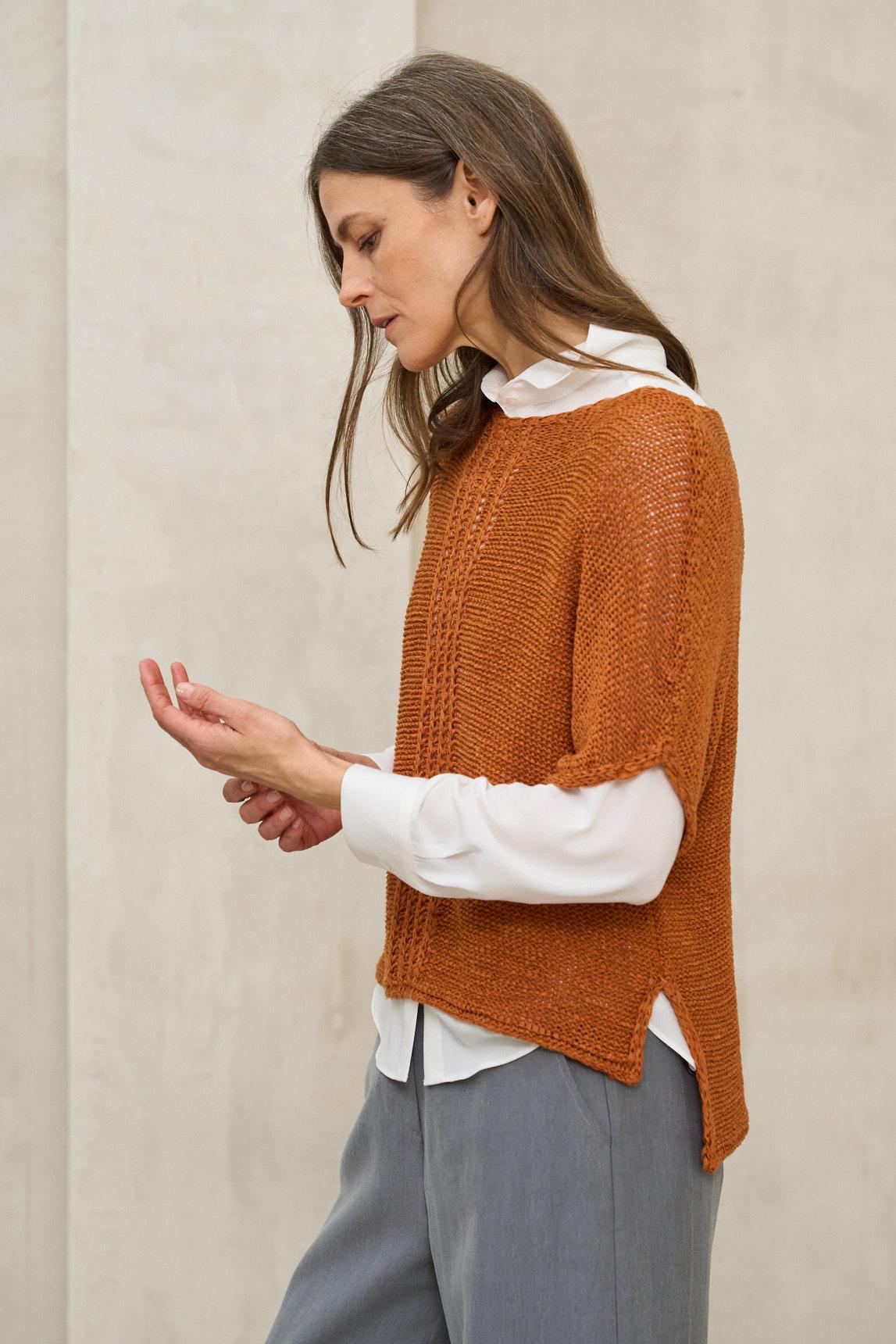 El jersey Calira terracota es una prenda ligera confeccionada en punto fino con textura sutil y acabado ligeramente translúcido. Su diseño de manga al codo aporta un aire actual y equilibrado, ideal para entretiempo o para los días templados en los que buscas una pieza cómoda pero con presencia.