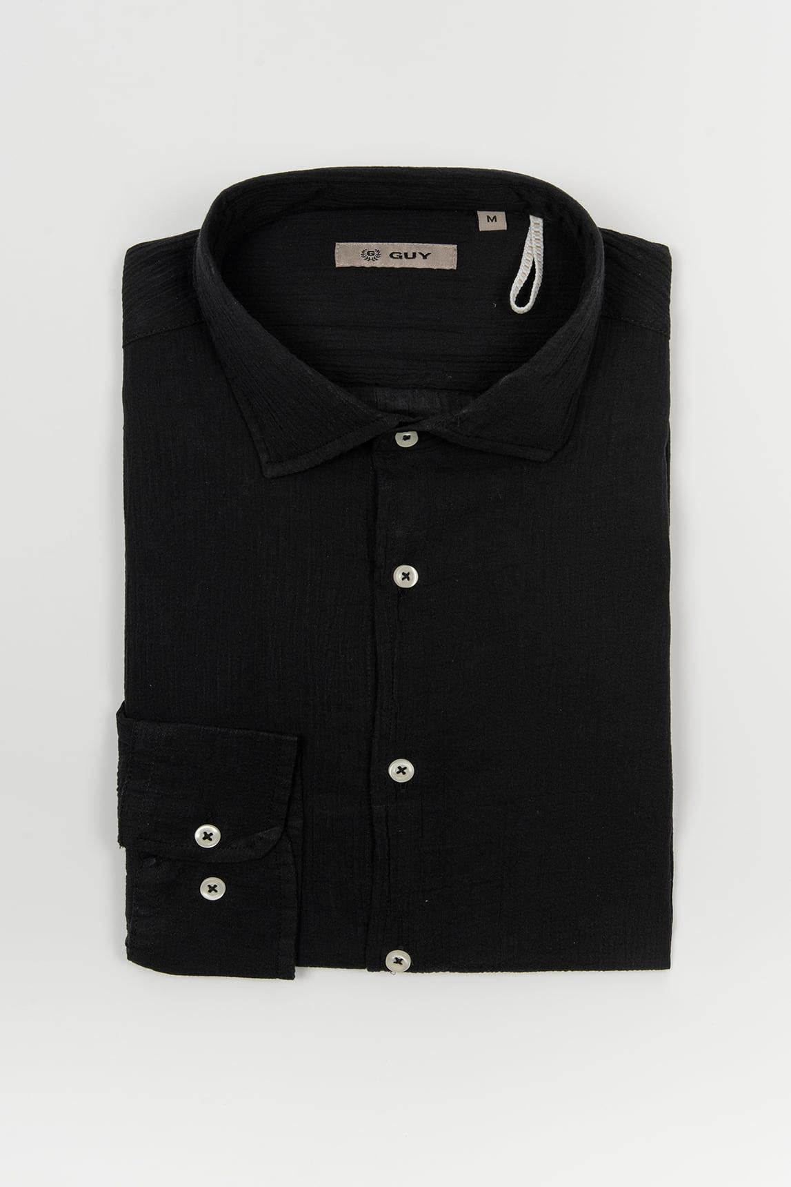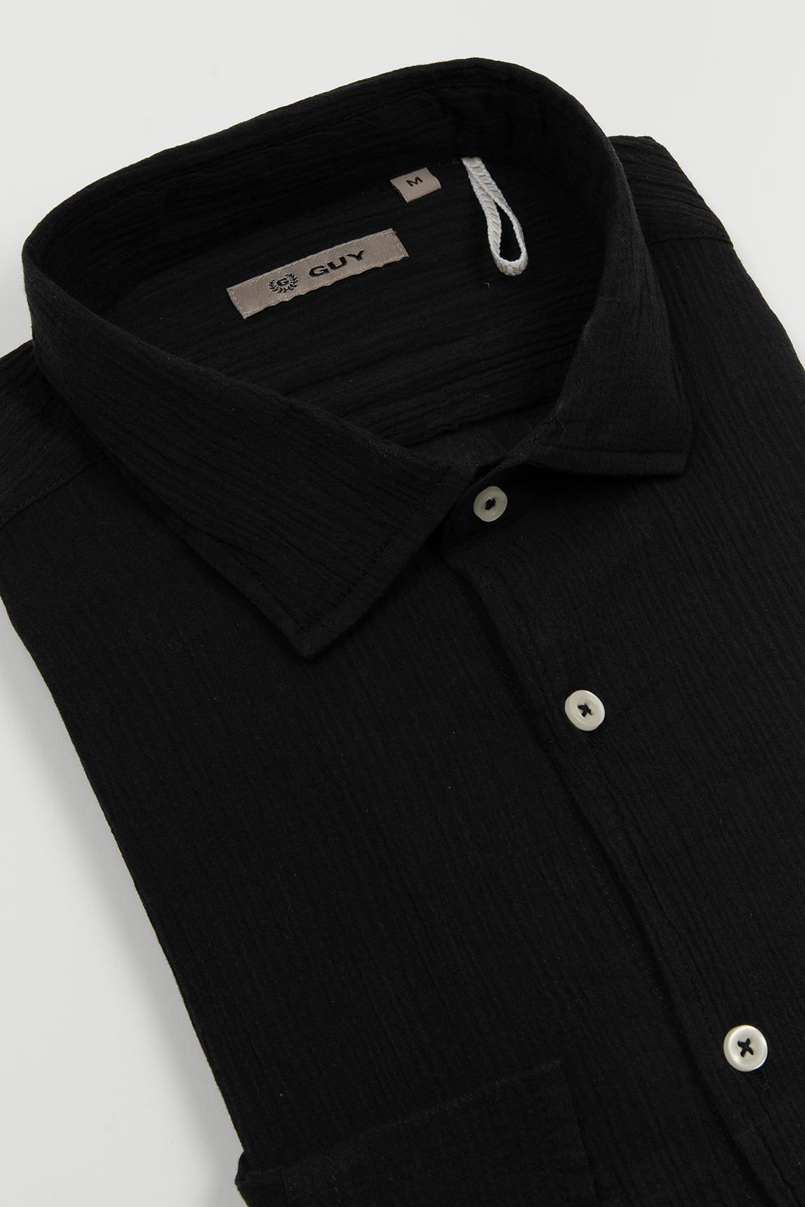 La camisa GUY en color negro destaca por su diseño limpio y contemporáneo, ideal para quienes buscan una prenda versátil con un estilo sobrio y elegante. Confeccionada en algodón ligero con textura suave y ligeramente arrugada, ofrece una sensación fresca y cómoda que la convierte en una opción perfecta para el día a día o para los meses más cálidos.