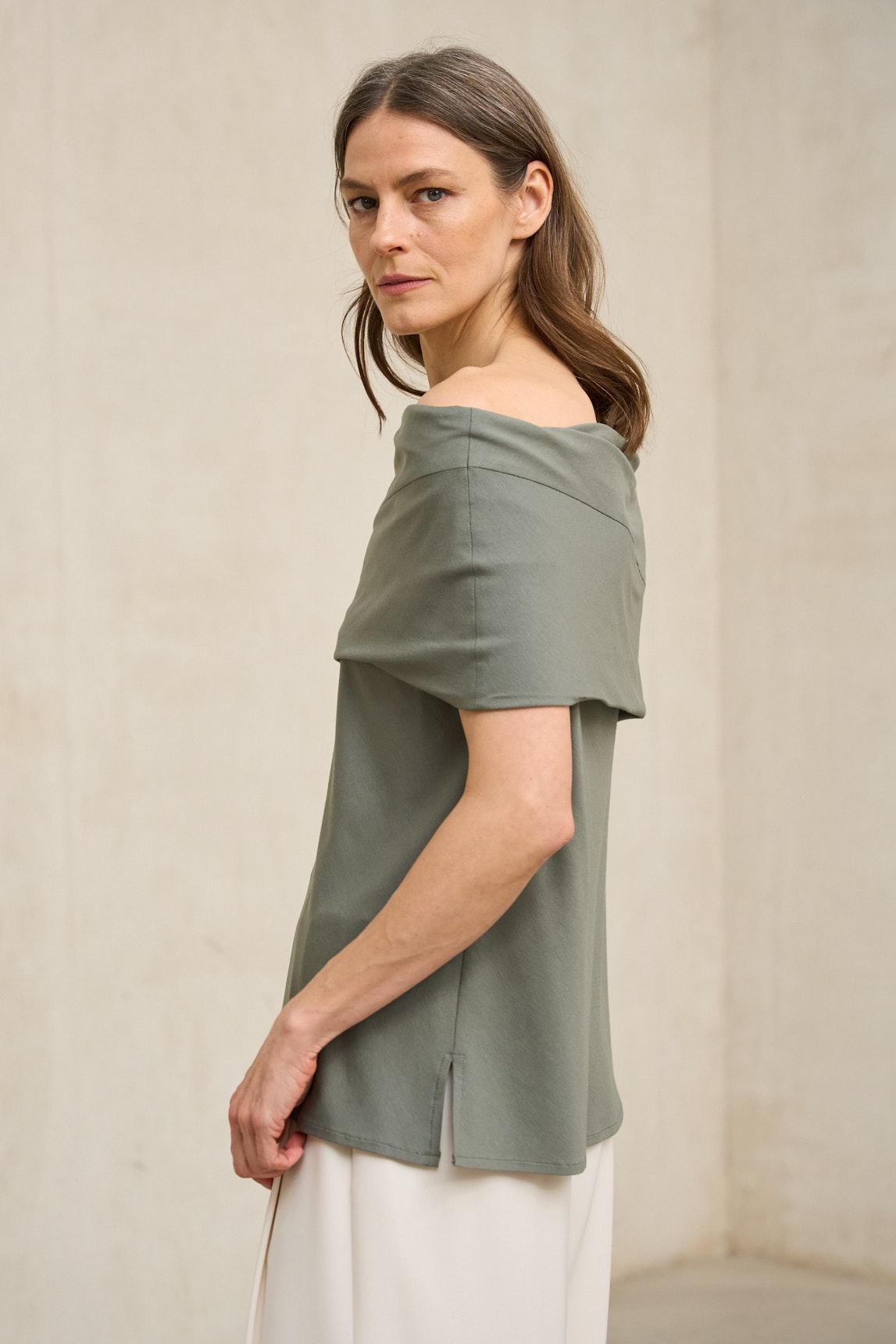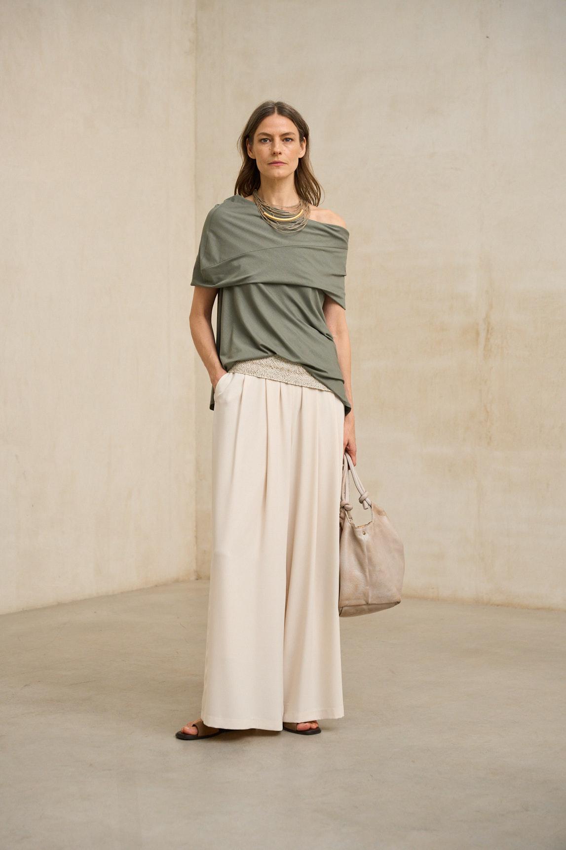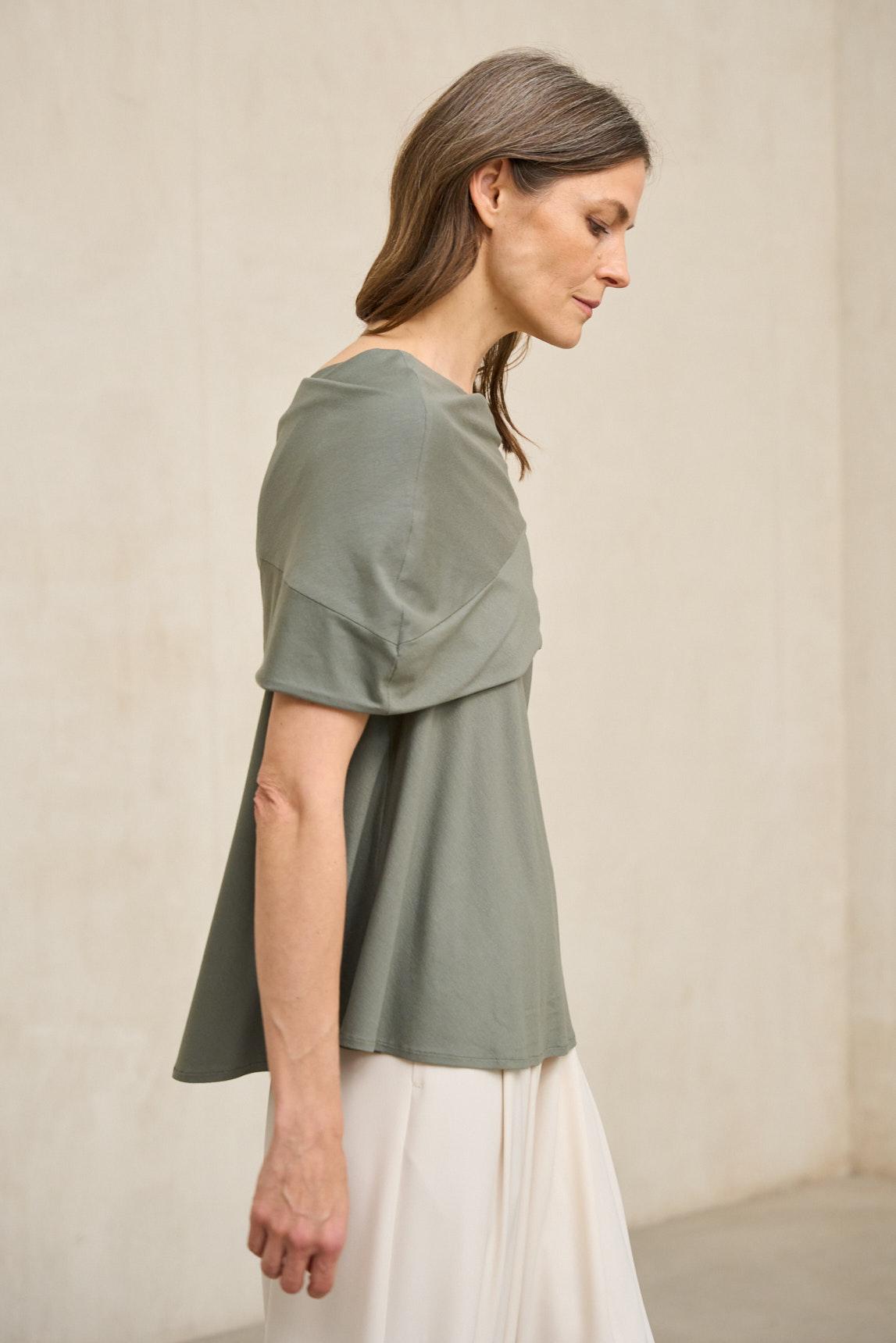 La Camiseta Oryen caqui combina un diseño contemporáneo con una silueta fluida y actual. Presenta escote amplio tipo barco con una banda superpuesta que genera un efecto estructurado en la parte superior, aportando volumen controlado y un acabado diferencial.