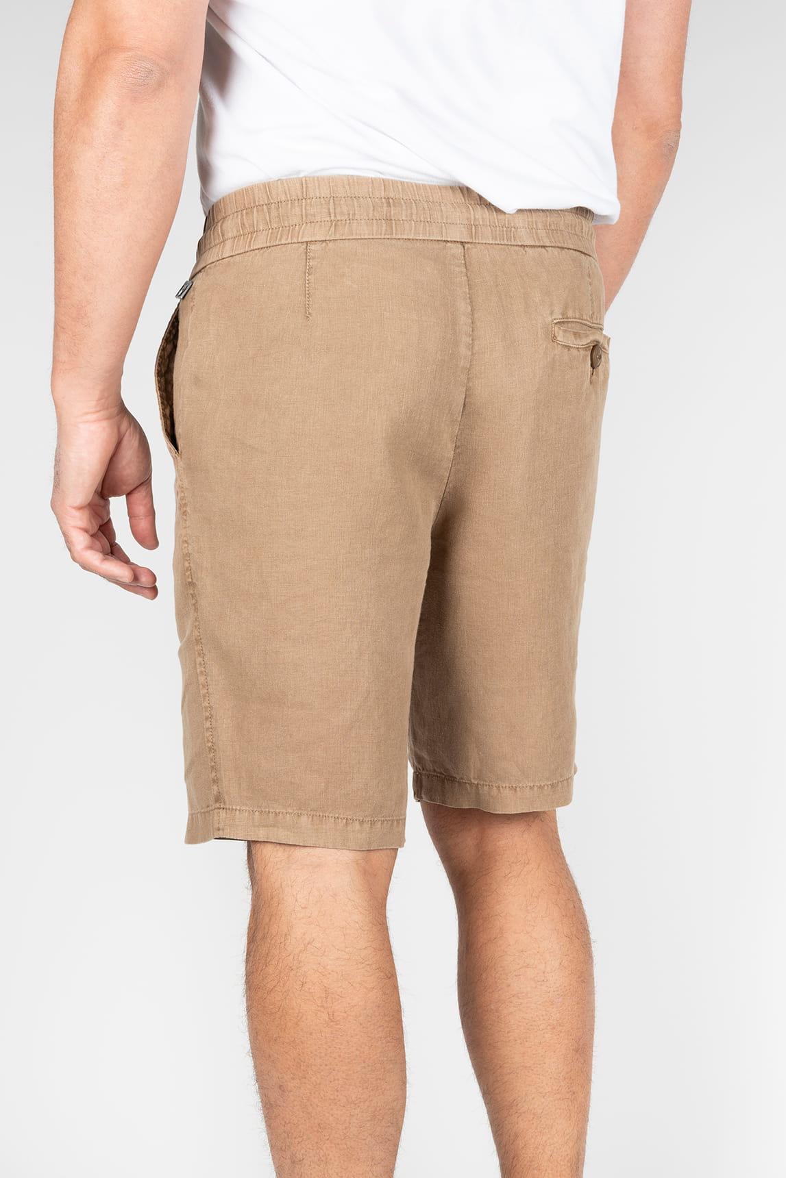 Esta bermuda en tono camel presenta una estética cálida y equilibrada, con largo por encima de la rodilla y una silueta recta que favorece la comodidad diaria. La cintura elástica con cordón ajustable se muestra de forma visible, aportando un carácter funcional y desenfadado, mientras los bolsillos laterales y el frente limpio mantienen una imagen ordenada. El tejido de apariencia ligera y textura suavemente natural ofrece una caída fluida que acompaña el movimiento con naturalidad.
