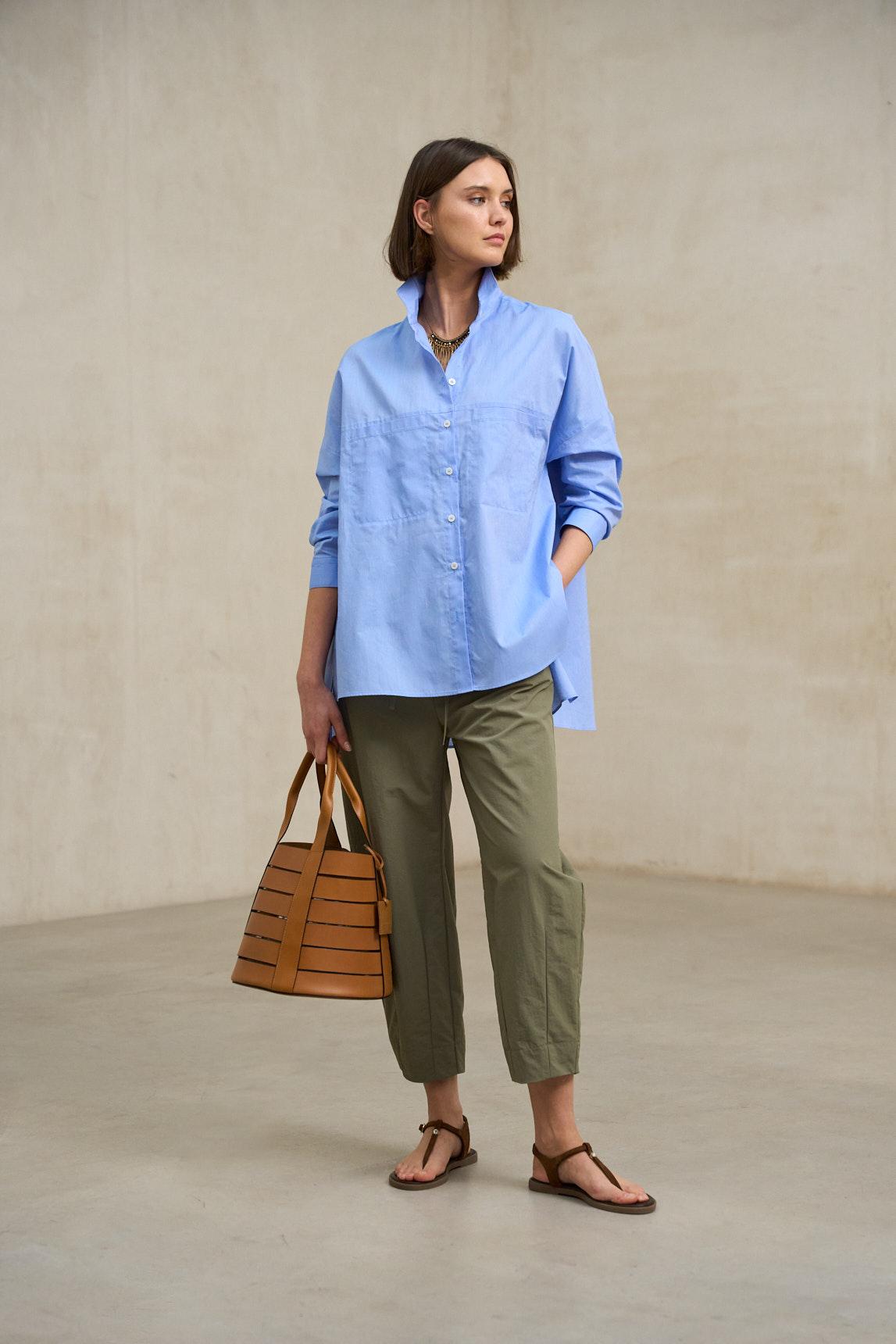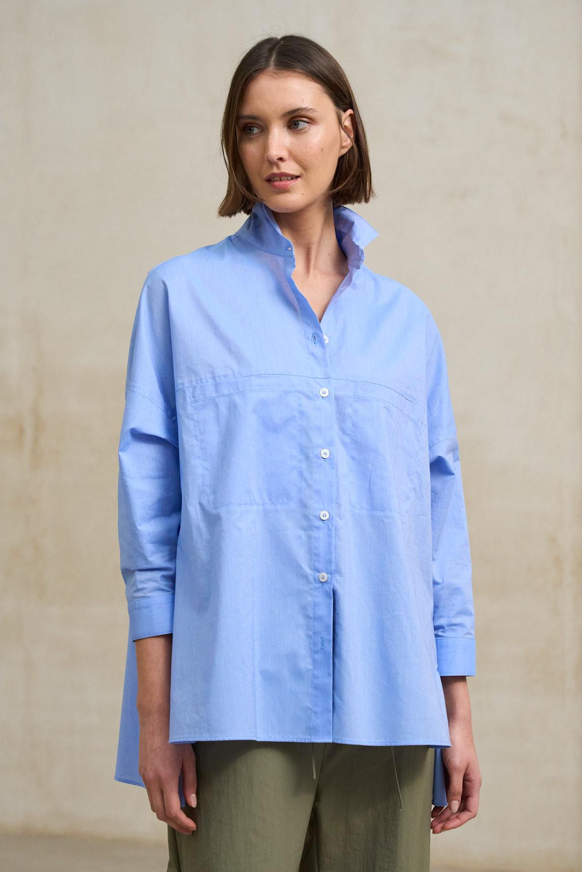 La Camisa Seraya azul medio es una prenda de líneas depuradas con una silueta relajada que combina frescura y estructura ligera. Confeccionada en tejido suave de caída natural, presenta cuello camisero clásico, cierre frontal con botones y manga larga con puño sencillo.