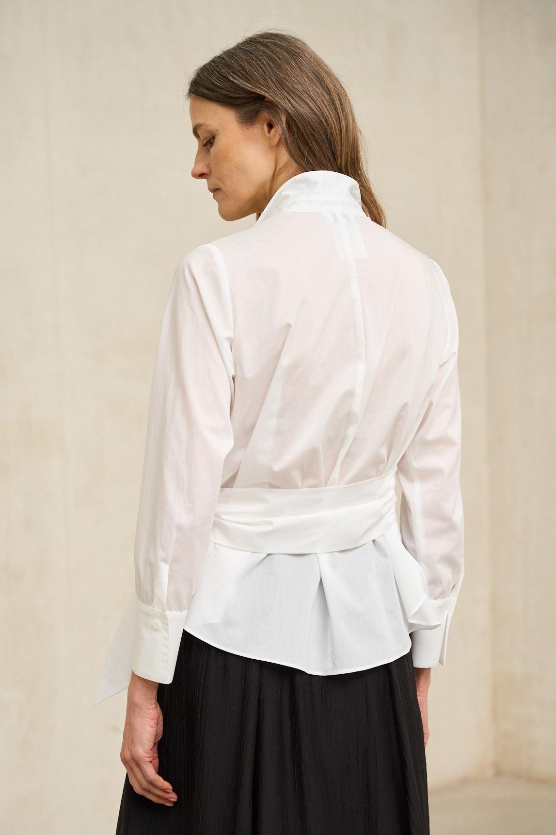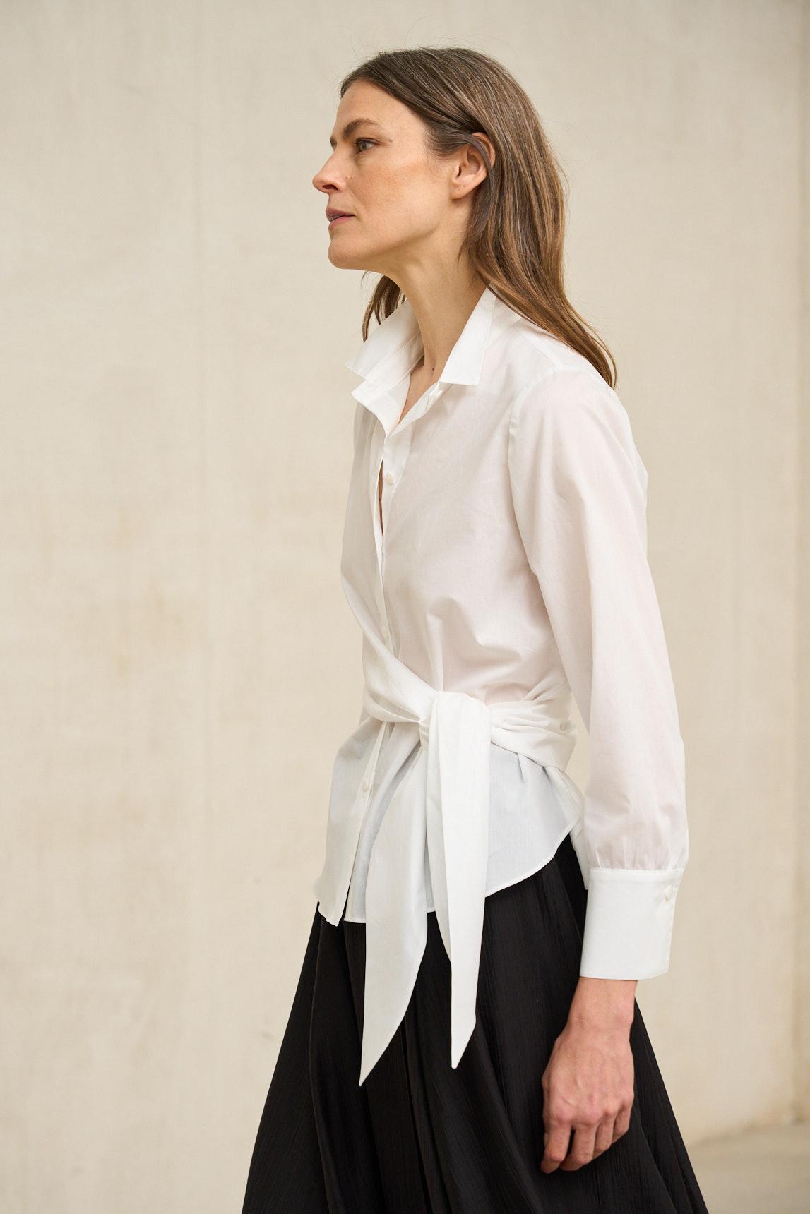 La Camisa Vaelia blanco roto destaca por su diseño cruzado con lazada lateral que aporta movimiento y un aire contemporáneo a la silueta clásica. Confeccionada en tejido ligero y de caída suave, presenta cuello camisero y manga larga con puño, equilibrando estructura y fluidez. El cruce frontal estiliza visualmente el torso y permite ajustar ligeramente la prenda mediante la lazada, creando una silueta femenina sin resultar ceñida. Su bajo ligeramente asimétrico aporta dinamismo y facilita llevarla tanto con pantalones rectos como con siluetas más amplias. El tono blanco roto suma luminosidad sin la frialdad del blanco óptico, integrándose con naturalidad en estilismos neutros junto a negro, camel, arena o gris claro. Es una pieza versátil que funciona tanto en contextos más formales como en looks urbanos refinados. Una camisa diferente y elegante que eleva cualquier conjunto sin perder sobriedad. Nos esforzamos por mostrar los colores de la forma más fiel posible, pero pueden variar ligeramente respecto a la realidad.