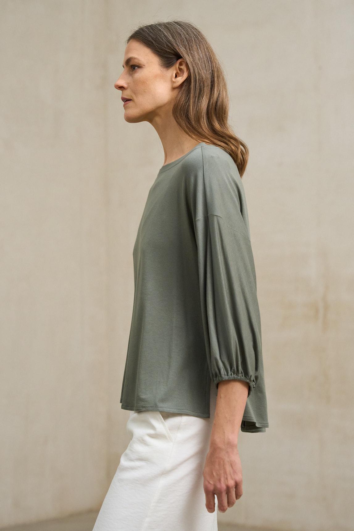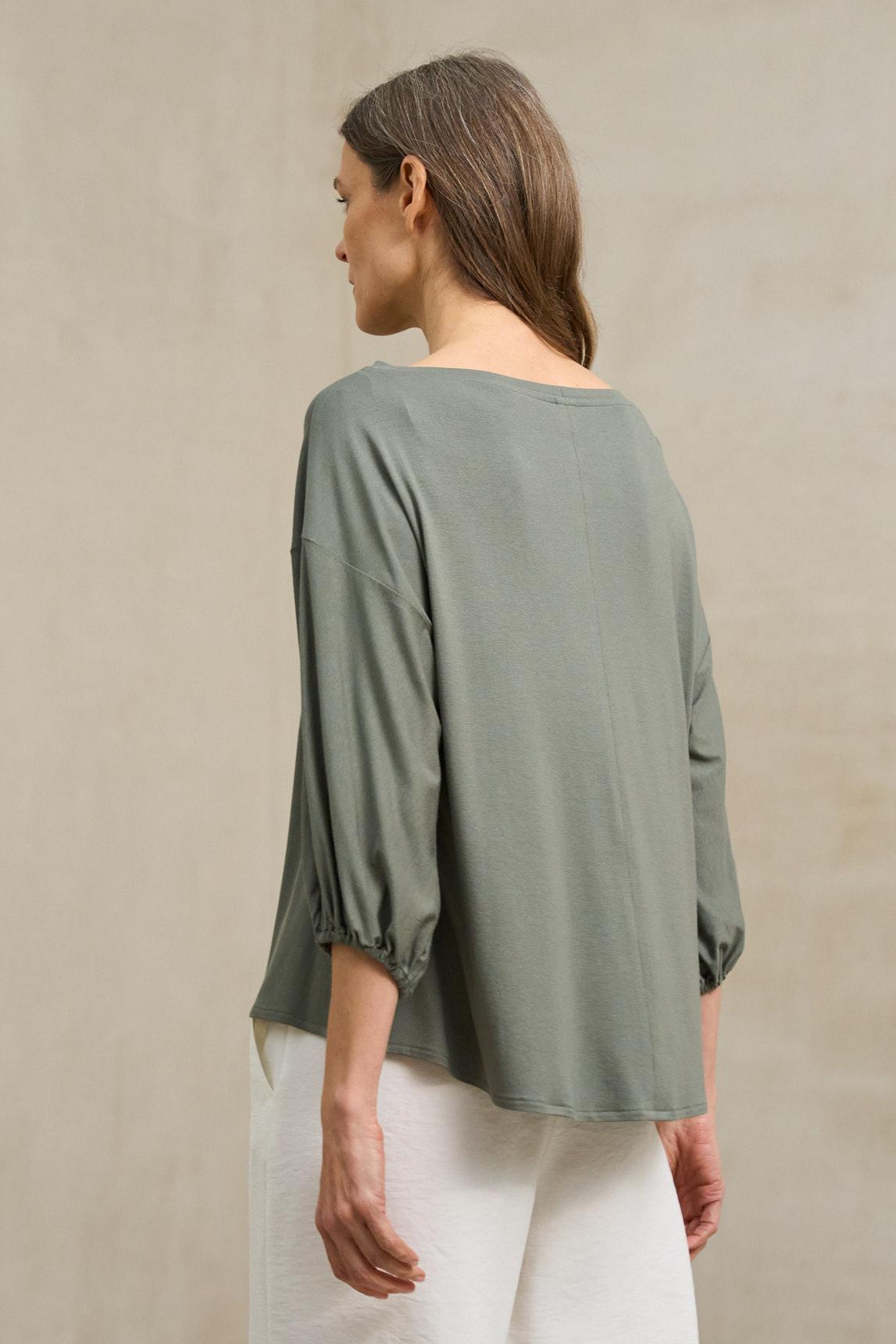 Camiseta de mujer confeccionada en tejido de punto ligero y suave al tacto. Presenta escote barco, manga larga con frunce elástico en el puño y un corte fluido que aporta comodidad y movimiento. Su diseño sencillo y la caída natural del tejido crean una silueta relajada y favorecedora.