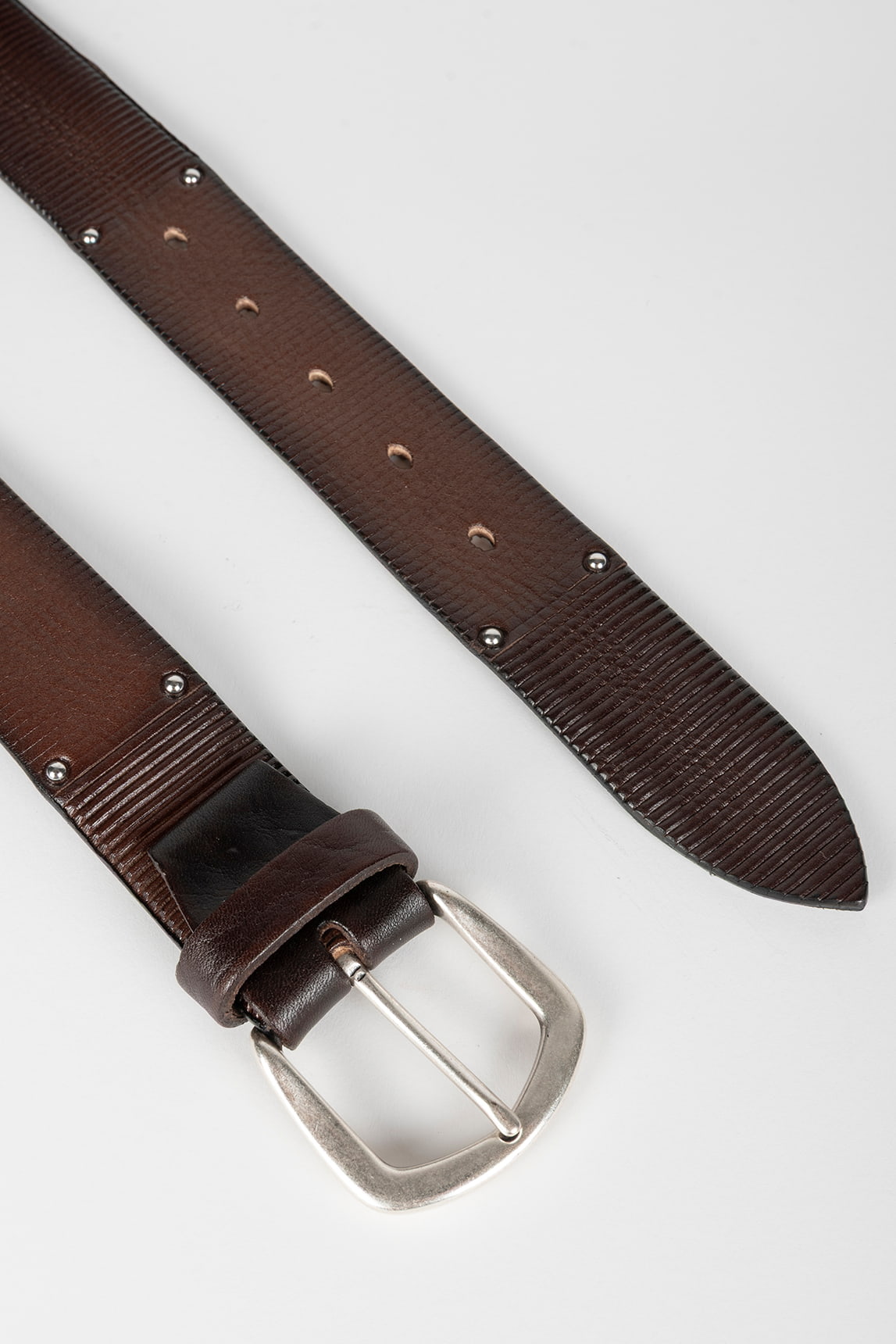 Un cinturón con carácter gracias al grabado lineal y los remaches sutiles, perfecto para dar un punto diferencial a looks casual y smart-casual.