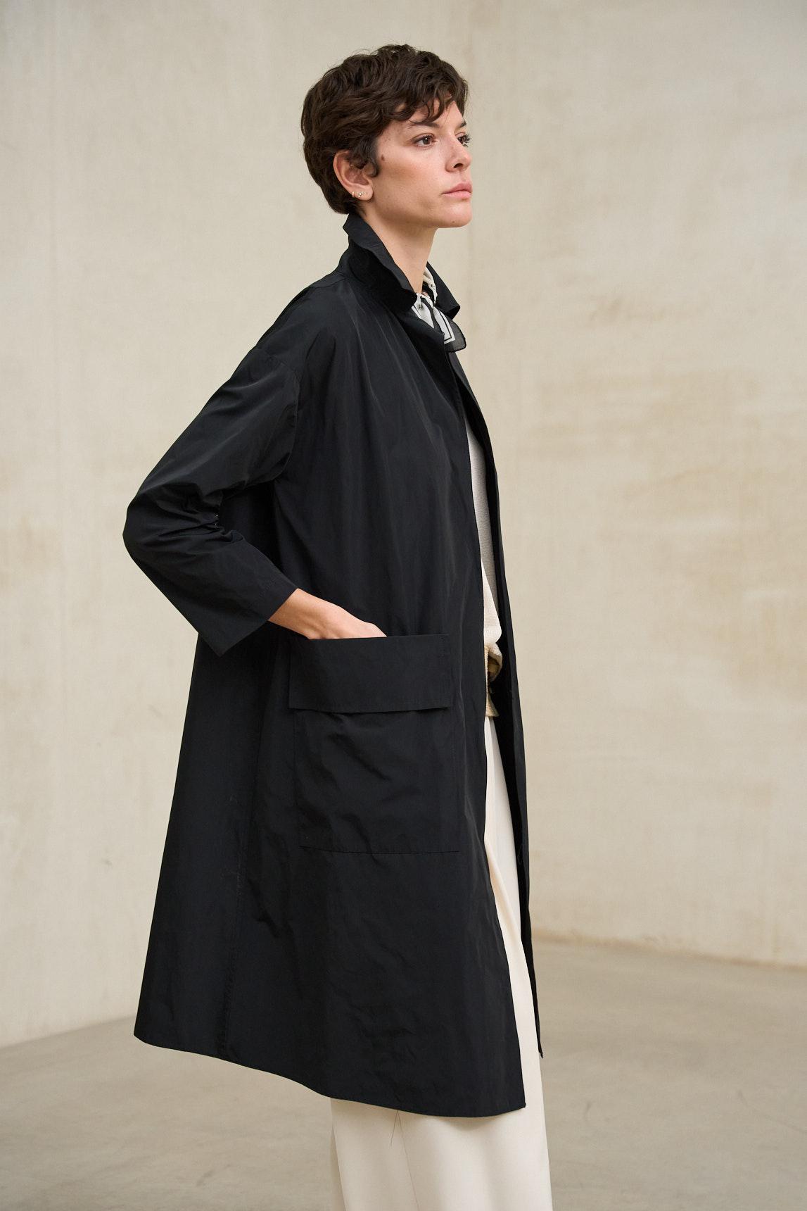 El tejido presenta un acabado liso con ligera textura arrugada y un sutil brillo, reforzando un aire contemporáneo y urbano. Su corte relajado permite llevarla tanto abierta como cerrada, adaptándose con facilidad a distintas capas y volúmenes. En negro, la gabardina adquiere un carácter más sobrio y versátil, ideal para acompañar looks diarios, estilismos de trabajo o combinaciones más depuradas de noche.