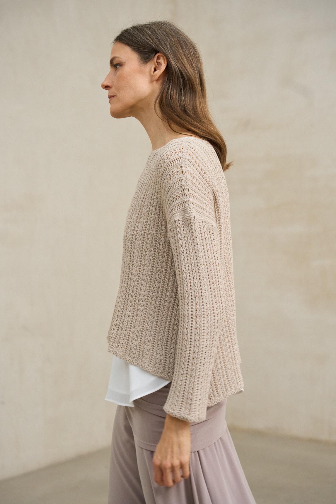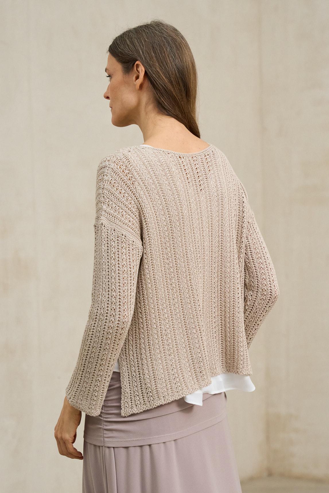 El jersey Nivara beige arena combina la ligereza del punto fino con un delicado trabajo calado en la parte superior que aporta textura y profundidad visual. Su tejido es ligeramente translúcido, por lo que se aconseja llevarlo con top interior (no incluido). Recomendamos el top Alenia blanco roto para un acabado natural y equilibrado.