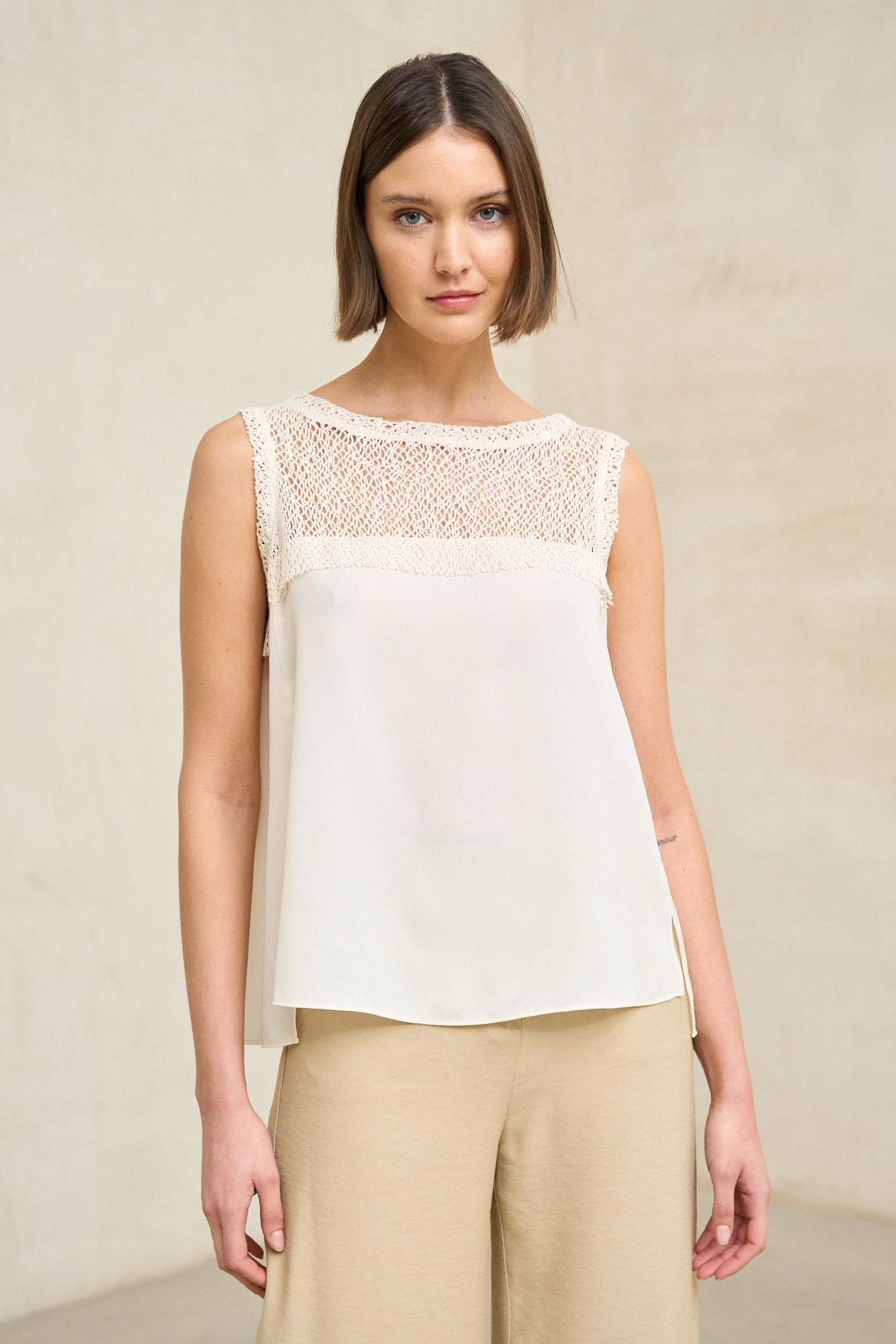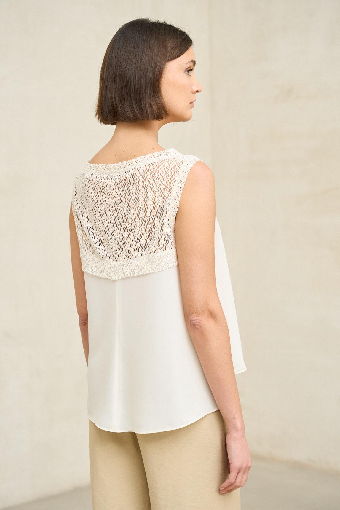 El Top Elenya crudo es una prenda ligera y femenina que combina sencillez con un sutil detalle artesanal. Confeccionado en tejido suave y de caída natural, presenta un diseño sin mangas con escote redondeado y acabado limpio. La parte superior incorpora un delicado panel calado que aporta textura y un juego visual elegante sin recargar el conjunto. Este detalle añade un matiz especial al diseño, manteniendo una estética depurada y atemporal.
