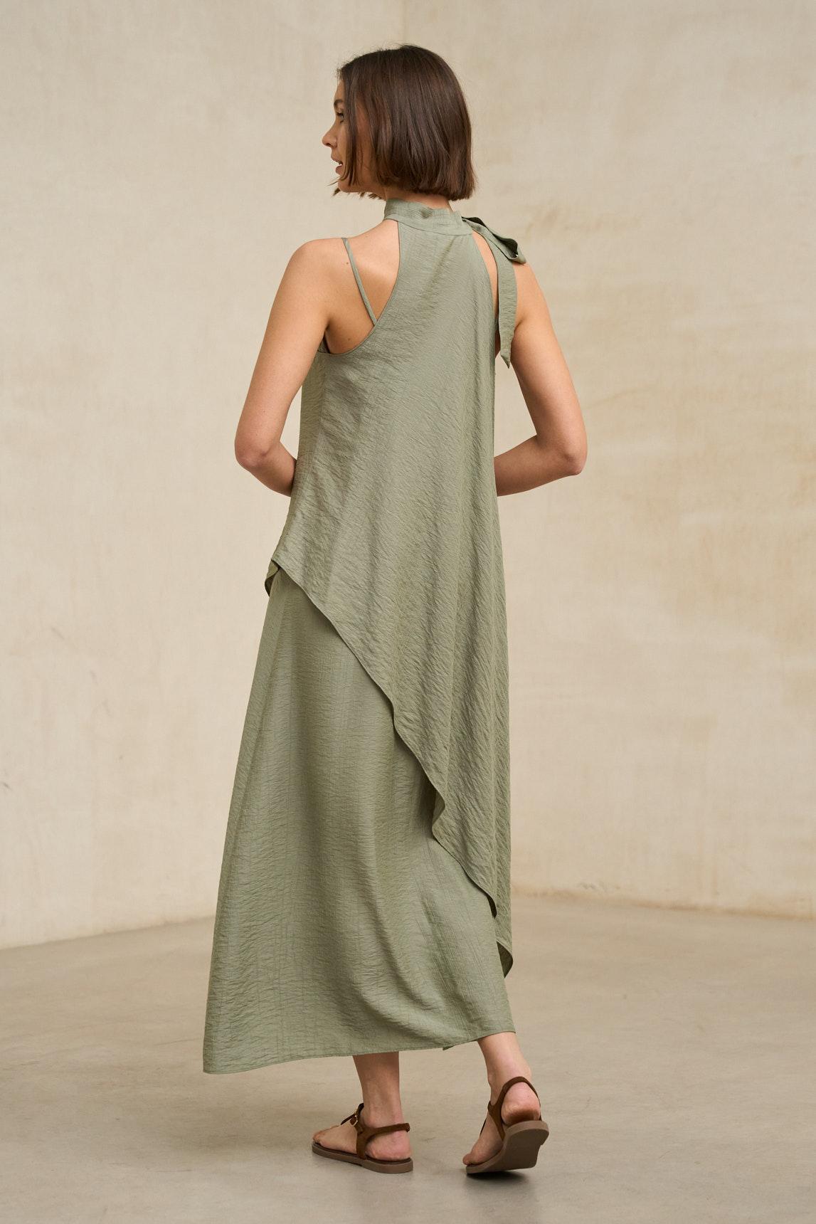 La pieza principal presenta una silueta amplia y fluida, confeccionada en tejido suave y vaporoso. Su diseño sin mangas y escote redondo limpio equilibra sencillez y sofisticación, mientras que el corte evasé genera una línea alargada que estiliza la figura. El bajo ligeramente asimétrico aporta dinamismo y fluidez al caminar, reforzando su carácter ligero y femenino. La segunda pieza complementa el diseño aportando mayor profundidad visual y versatilidad al conjunto, permitiendo que el vestido gane presencia sin perder su esencia relajada.