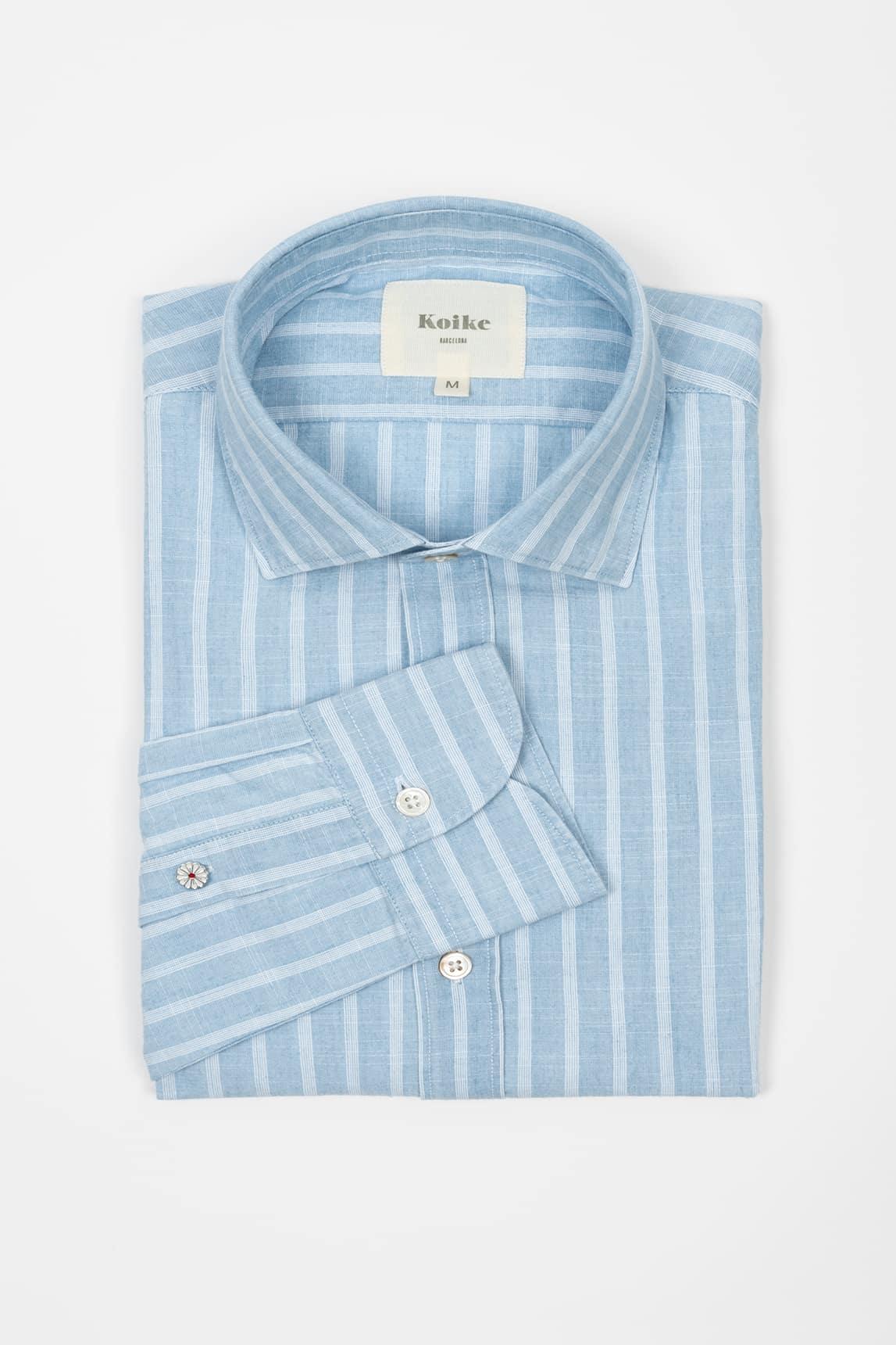 Camisa de hombre en color azul con raya vertical blanca, silueta recta y cuello clásico. El modelo incorpora cierre frontal de botones, manga larga y puño abotonado, construyendo una imagen ordenada y actual. La raya marcada aporta profundidad visual y ritmo al diseño, mientras el acabado general mantiene una presencia equilibrada entre lo clásico y lo contemporáneo.