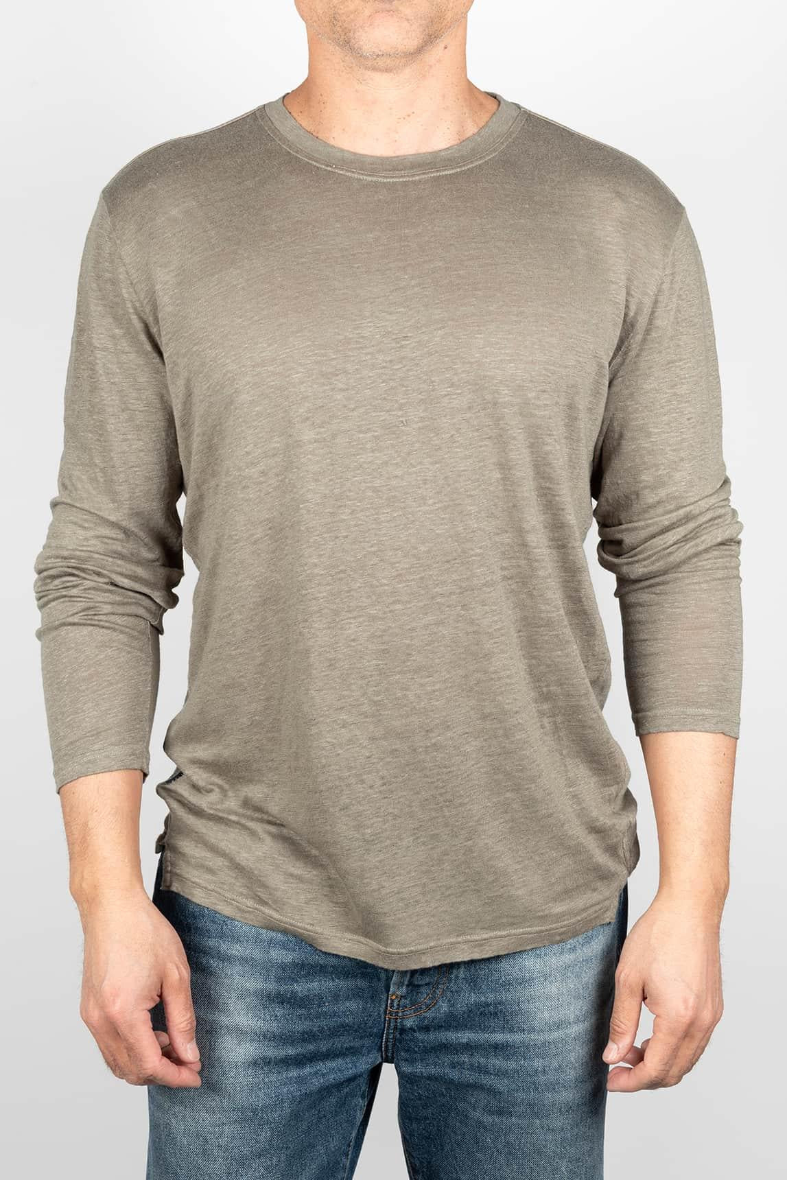Esta camiseta en tono caqui de la marca Keeling presenta un diseño limpio y versátil con cuello redondo y manga larga, pensada para ofrecer comodidad con un enfoque natural. Su tejido de aspecto ligeramente jaspeado aporta una textura suave y visualmente rica, con una caída fluida que se adapta al cuerpo sin rigidez. Los acabados sencillos y el bajo recto refuerzan su carácter esencial, convirtiéndola en una prenda fácil de integrar en el día a día.