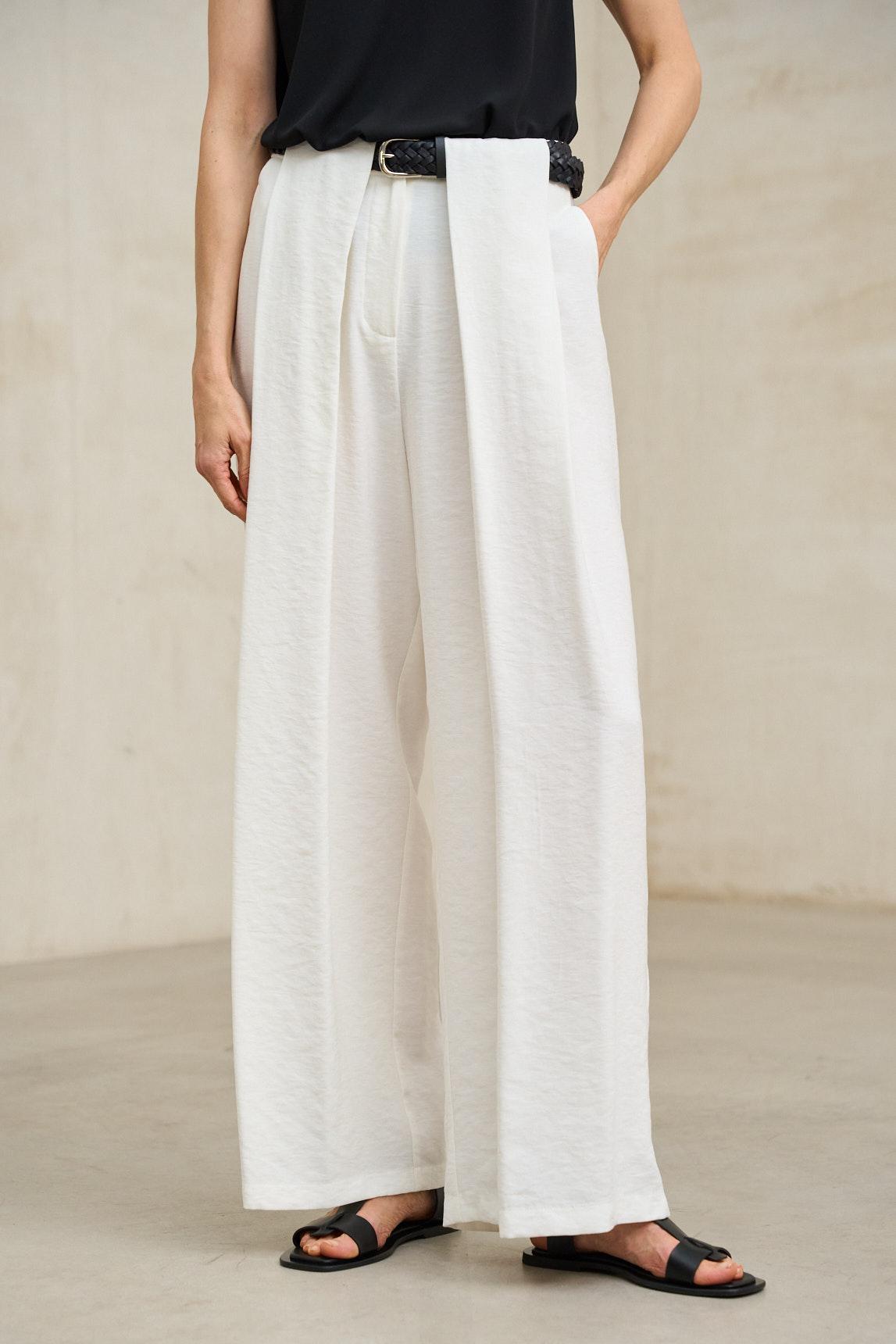 Este pantalón se define por una silueta amplia de líneas rectas y una caída fluida que acompaña el movimiento del cuerpo. Las pinzas frontales estructuran la prenda desde la cintura, aportando volumen sin rigidez. El cierre frontal con botón visible refuerza su diseño depurado, mientras que el tejido muestra una textura arrugada marcada y vertical que recorre toda la superficie, aportando interés visual y ligereza.