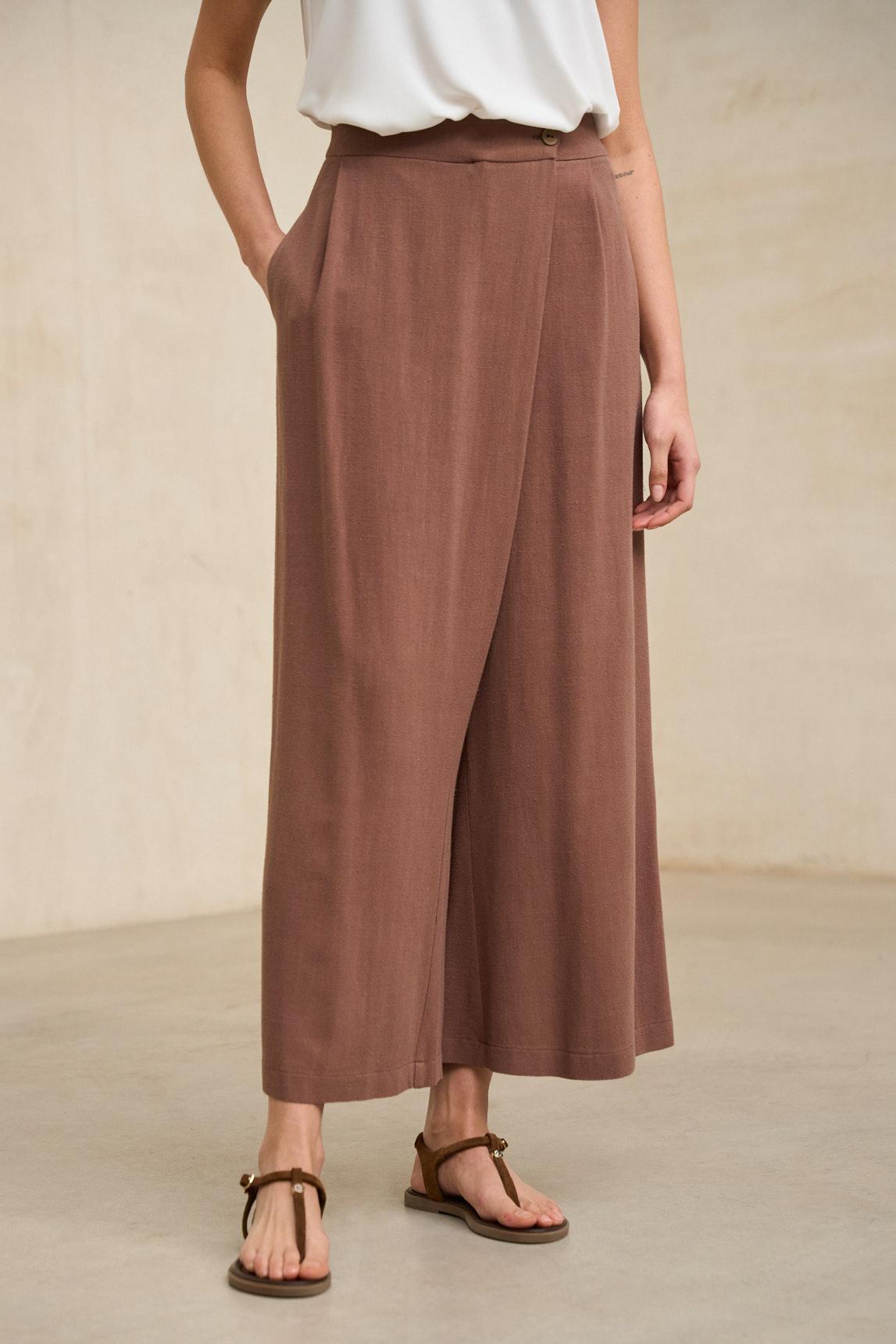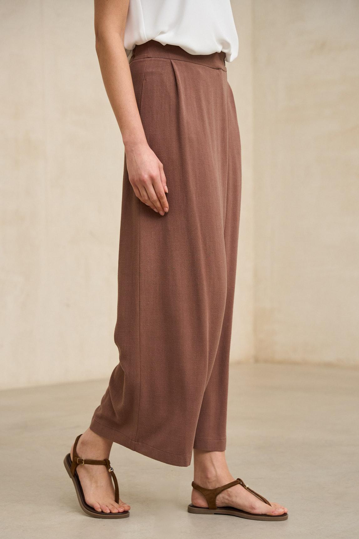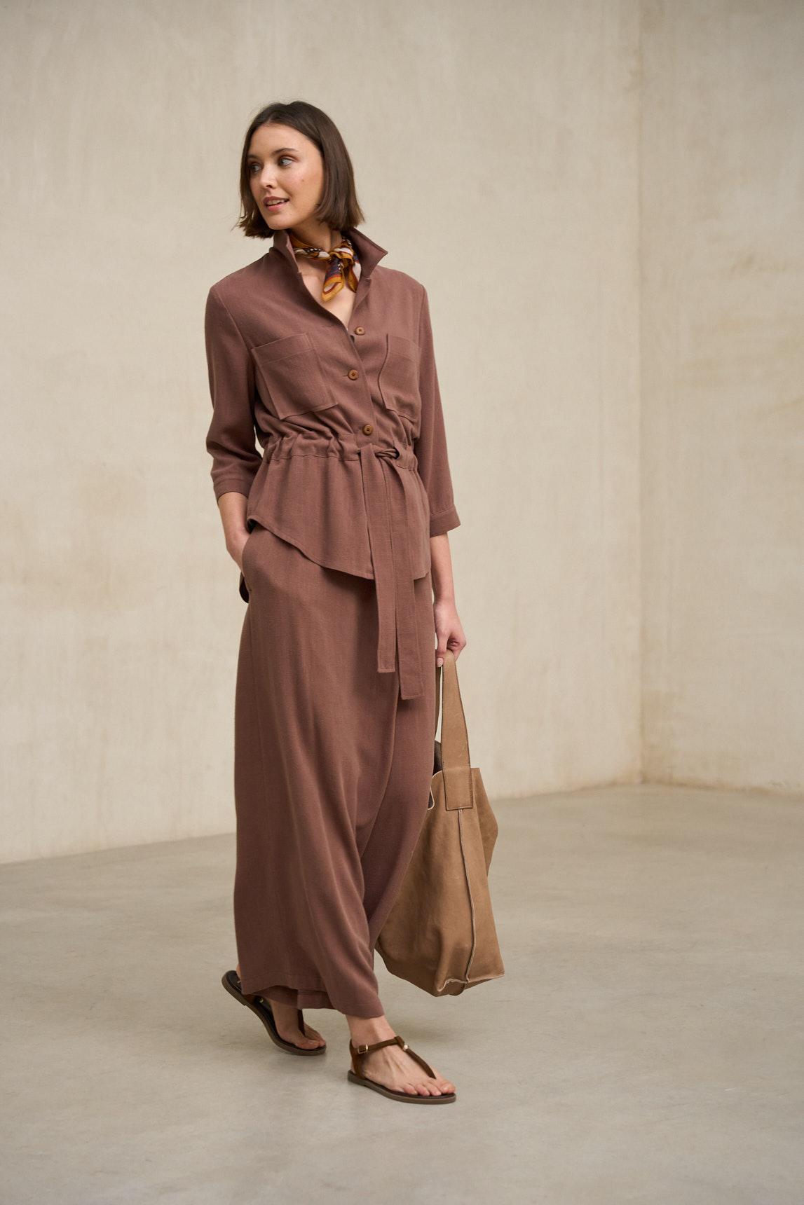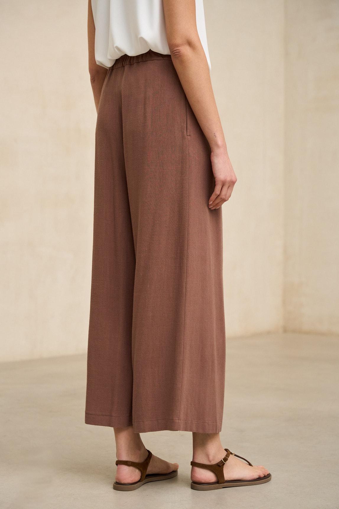 El pantalón Narel marrón terracota mantiene su característica silueta amplia con largo tobillero, aportando ligereza visual y un movimiento fluido al caminar. Su corte recto genera una caída limpia y continua que estiliza la figura sin perder comodidad. La cinturilla estructurada equilibra el volumen de la pernera, creando una proporción armónica y favorecedora.