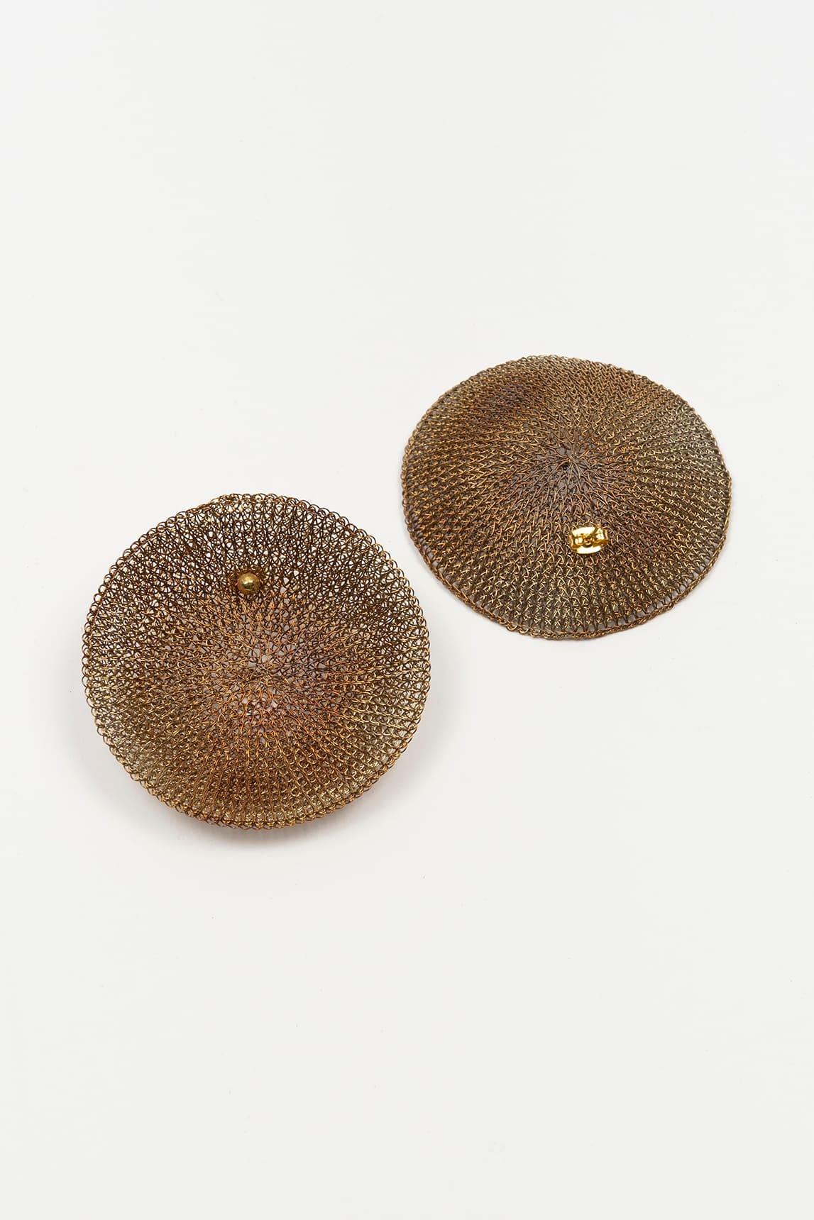 Pendientes de mujer con acabado tornasolado y diseño circular de malla metálica. La superficie presenta un entramado fino que genera un efecto ligero y muy visual, con reflejos cambiantes que aportan profundidad y dinamismo al metal. Su forma plana y redonda crea una silueta equilibrada y contemporánea, con un punto central que refuerza su estética limpia.