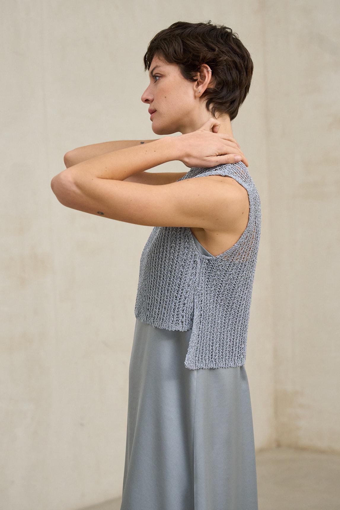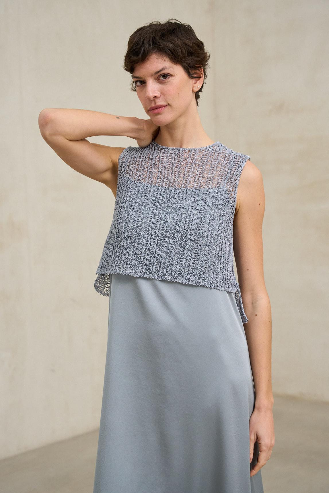 The Erya steel blue vest is a lightweight garment made from an open-weave knit that lends a delicate and ethereal effect to the design. Its semi-open weave creates a subtle layering effect, subtly revealing the undergarment underneath, so it's recommended to pair it with a basic top or plain t-shirt (not included). It features a round neck and sleeveless design, with a clean, straight silhouette that balances the fabric's texture. Its lightweight construction makes it ideal for layering, adding visual depth without adding weight to the outfit. The bluish-gray tone reinforces its contemporary and versatile character, allowing it to be combined with flowing trousers, skirts, or denim. It's a perfect garment for transitional outfits that seek texture, freshness, and a modern finish. We strive to display colors as accurately as possible, but they may vary slightly from reality.