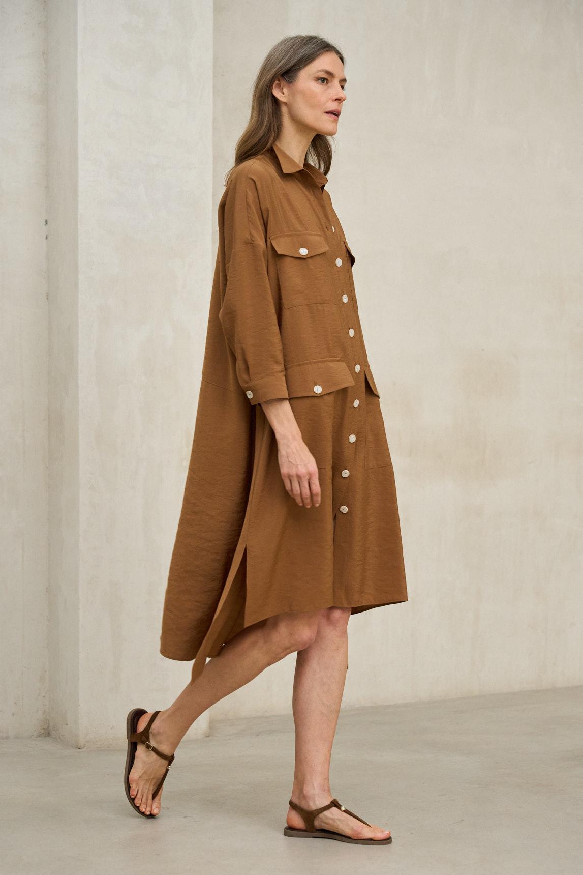The Maëron copper dress is a utilitarian-inspired piece that combines structure and fluidity in a contemporary design. Crafted from a lightweight, natural-feel fabric, it features a shirt collar, button-front closure, and patch pockets with flaps that reinforce its functional character. Its slightly wide short sleeves and straight cut provide comfort, while the lower front slit adds movement and lightness when walking. The copper tone enhances its versatility and makes it an easy garment to combine with transitional or summer outfits. It can be worn as a closed dress or slightly open over flowing trousers for a more contemporary look. The Maëron Dress balances practicality and relaxed elegance, ideal for those seeking pieces with personality and a soft structure. We strive to display colors as accurately as possible, but they may vary slightly from reality.