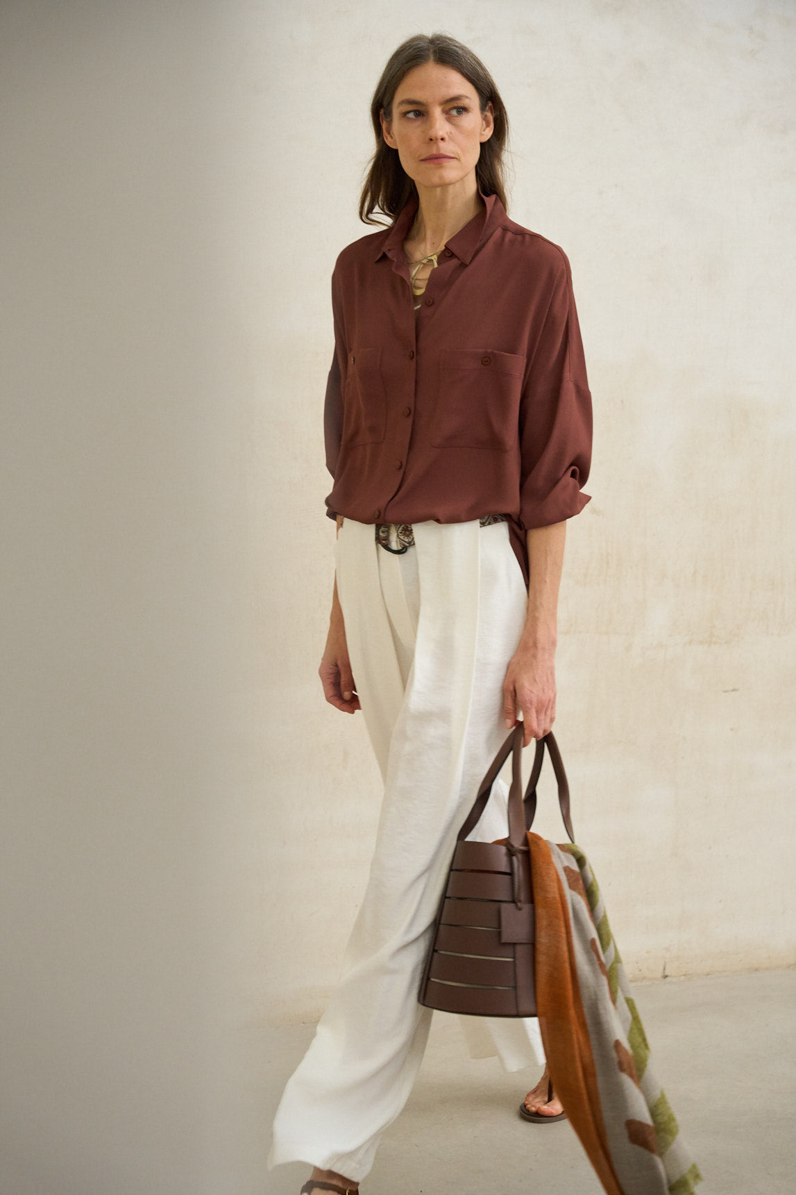 Camisa de senhora confecionada em cetim leve com um brilho subtil que realça o seu tom castanho. Apresenta uma gola clássica, fecho frontal com botões na mesma cor e dois bolsos com pala que equilibram o design. As mangas compridas com punhos simples e a bainha direita permitem que seja usada por dentro ou por fora das calças/saia. O seu corte fluido e textura acetinada conferem um ar sofisticado e intemporal. A camisa cobre da Éline é perfeita para elevar os looks do dia a dia com calças de pernas largas, saia midi ou jeans, e também para um look mais requintado em ocasiões casuais. Uma peça versátil que alia a elegância descomplicada ao conforto contemporâneo. Esforçamo-nos por exibir as cores da forma mais precisa possível, mas podem variar ligeiramente da realidade.