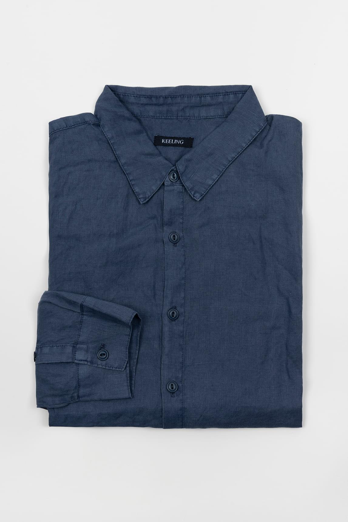 Men's long-sleeved navy blue shirt, with a straight silhouette and a crinkled texture that provides visual movement and a natural finish. The design incorporates a classic collar, front tone-on-tone button closure, and buttoned cuffs, maintaining a clean look with a casual touch. The lightweight structure favors a comfortable drape and turns the dark color into a sophisticated base with more depth.