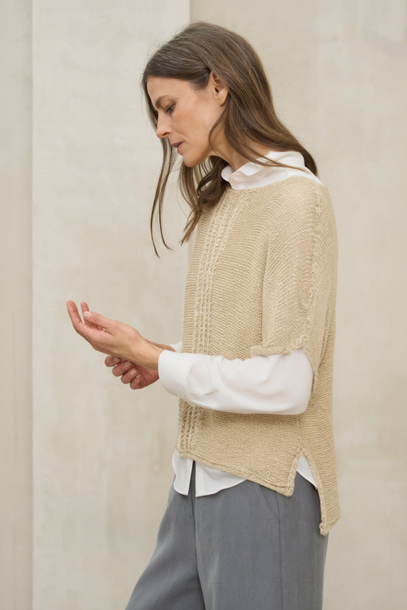 A camisola Calira na cor cru é uma peça leve, confecionada em malha fina com uma textura subtil e um acabamento semitransparente, que proporciona uma sensação delicada e arejada. As suas mangas até ao cotovelo equilibram as proporções e conferem um toque contemporâneo, ideal para a meia-estação ou dias amenos.