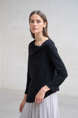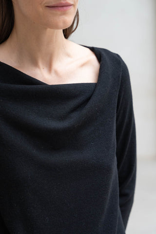 - Camisola de manga comprida com gola em bico ligeiramente drapeada.