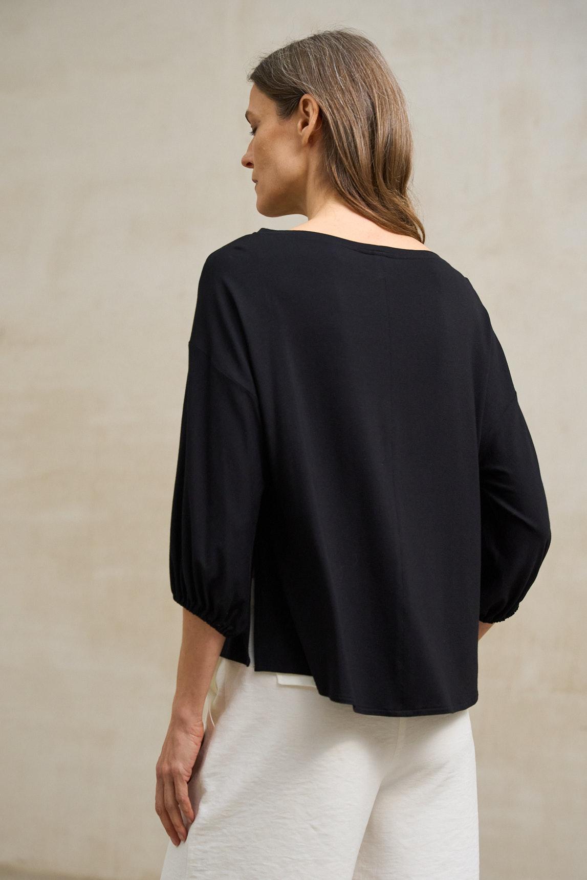 Camiseta de mujer confeccionada en tejido de punto ligero con caída fluida y tacto suave. Presenta escote barco, manga larga con frunce elástico en el puño y un corte relajado que favorece la silueta. Su diseño limpio y minimalista la convierte en una prenda cómoda y versátil para cualquier ocasión. La Camiseta Eira negra aporta un aire sofisticado a los conjuntos más sencillos. Perfecta para combinar con pantalones amplios, faldas o prendas de inspiración urbana, se adapta con facilidad tanto a looks de día como de noche gracias a su color profundo y atemporal. Nos esforzamos por mostrar los colores de la forma más fiel posible, pero pueden variar ligeramente respecto a la realidad.