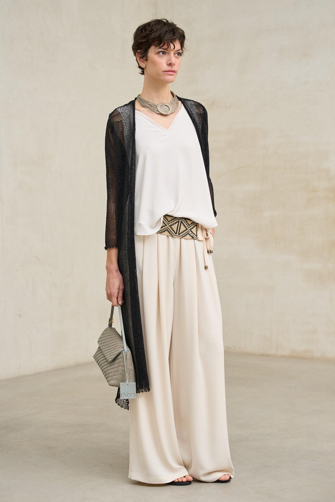 El tejido de punto es sutilmente translúcido, lo que permite jugar con las capas y contrastes. Para un acabado limpio y equilibrado, recomendamos combinarla con un top básico como el Top Alenia blanco roto (no incluido). Las mangas tres cuartos y la caída suave refuerzan su carácter sofisticado y contemporáneo.
