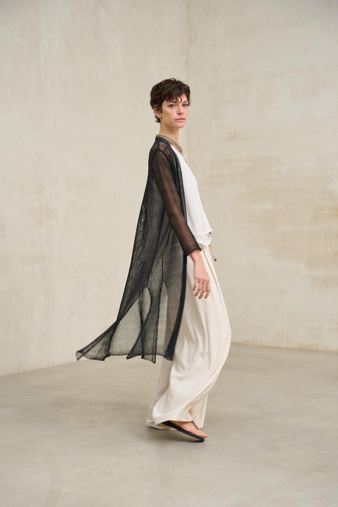 La levita de punto Avenel negro es una pieza ligera y etérea confeccionada en tejido de punto calado con textura abierta, que aporta profundidad visual y movimiento. Su diseño largo y abierto estiliza la figura, creando una línea vertical elegante y fluida.