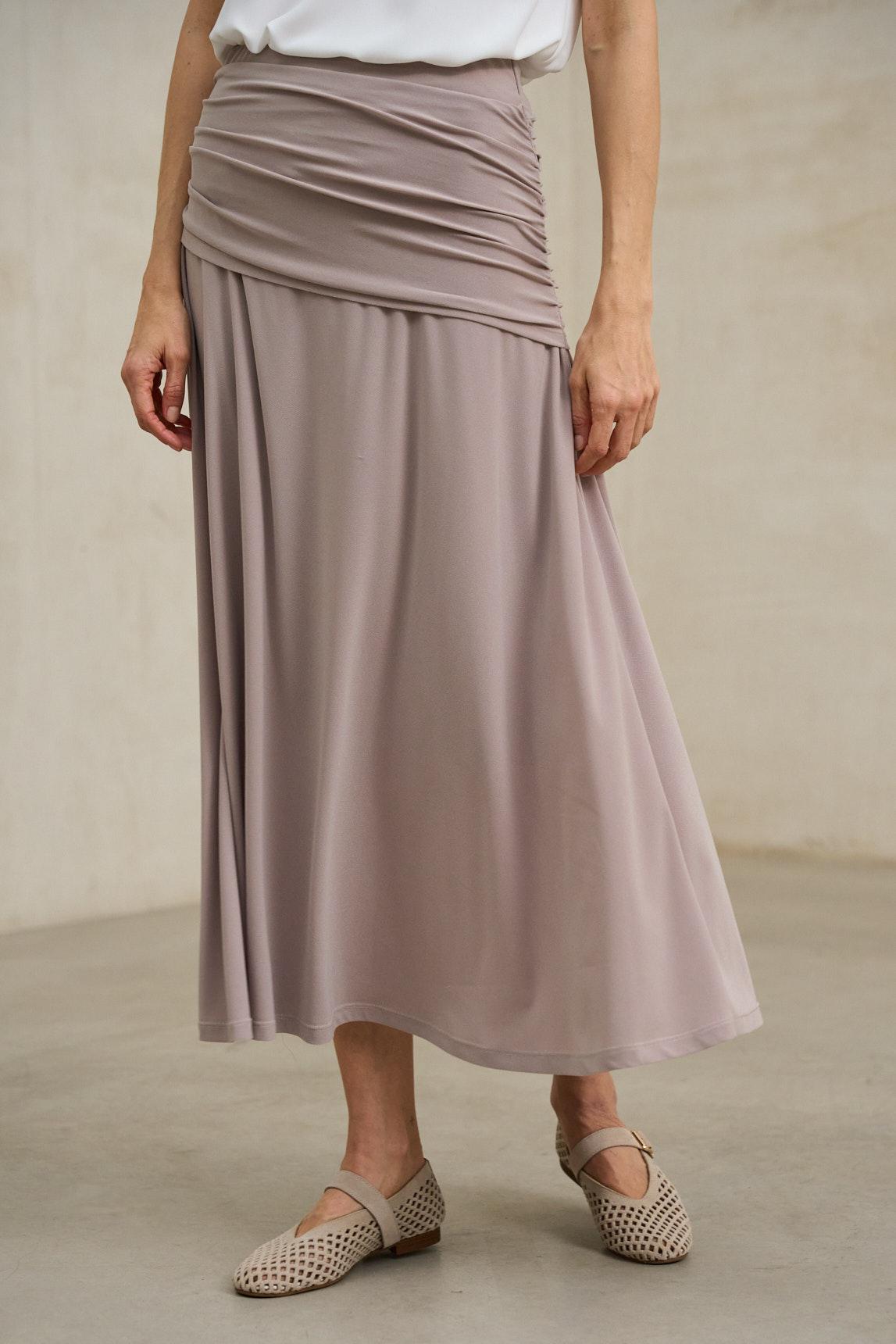 Saia de menina confecionada em malha fluida com um elegante efeito drapeado na parte superior. O seu cós alto com faixa larga abraça a silhueta, proporcionando conforto e um ajuste impecável. O comprimento alongado e o cair suave do tecido criam um movimento natural que realça o seu carácter sofisticado. A saia Kaia em cor taupe é uma peça versátil e intemporal. O seu tom neutro e o seu corte fluído permitem combiná-la com camisas, blusas ou casacos leves, adaptando-se facilmente tanto a looks diurnos como a estilos noturnos mais sofisticados. Esforçamo-nos por exibir as cores da forma mais precisa possível, mas podem variar ligeiramente da realidade.