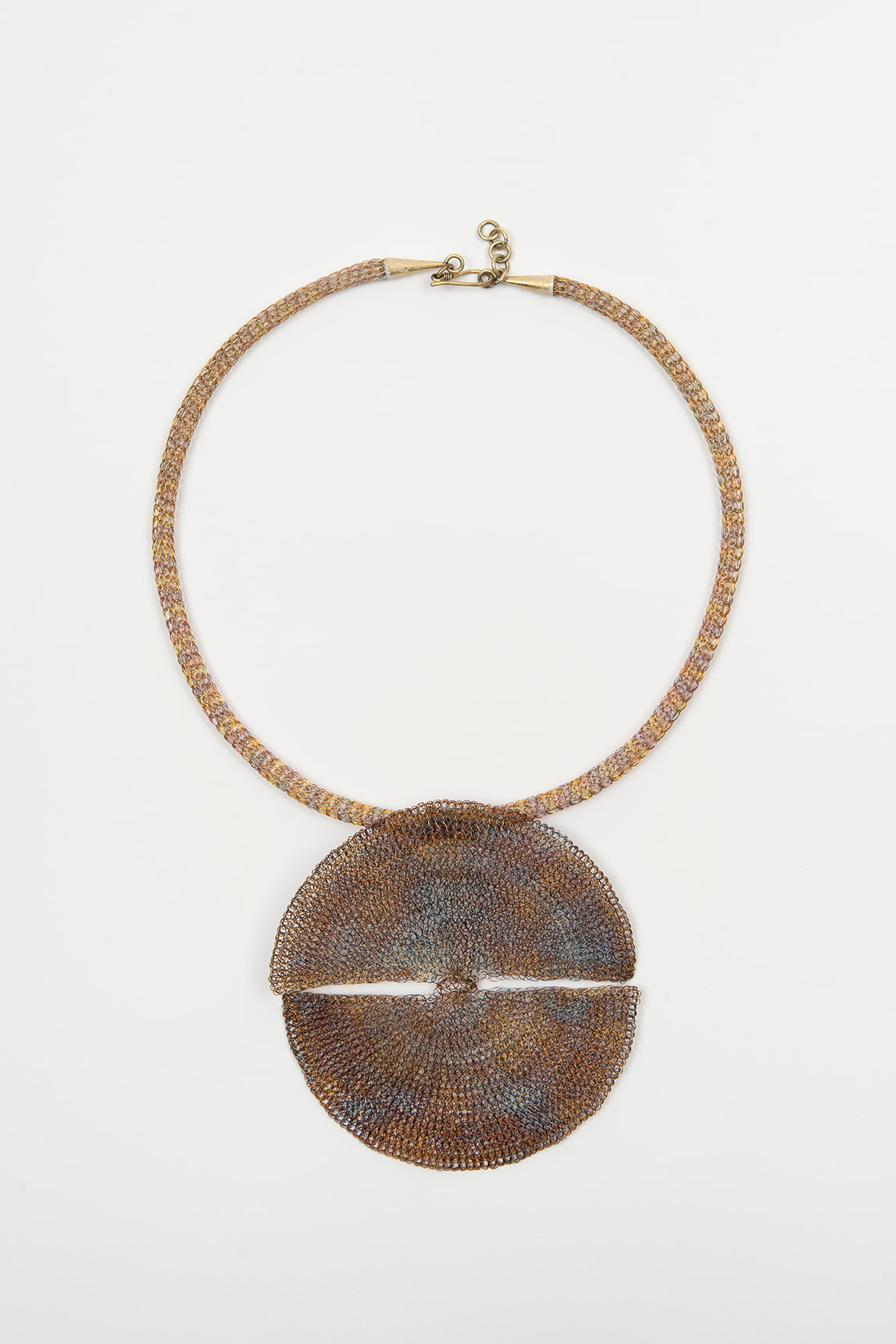 - Collar corto con pieza central circular de malla metálica en tonos bronce.