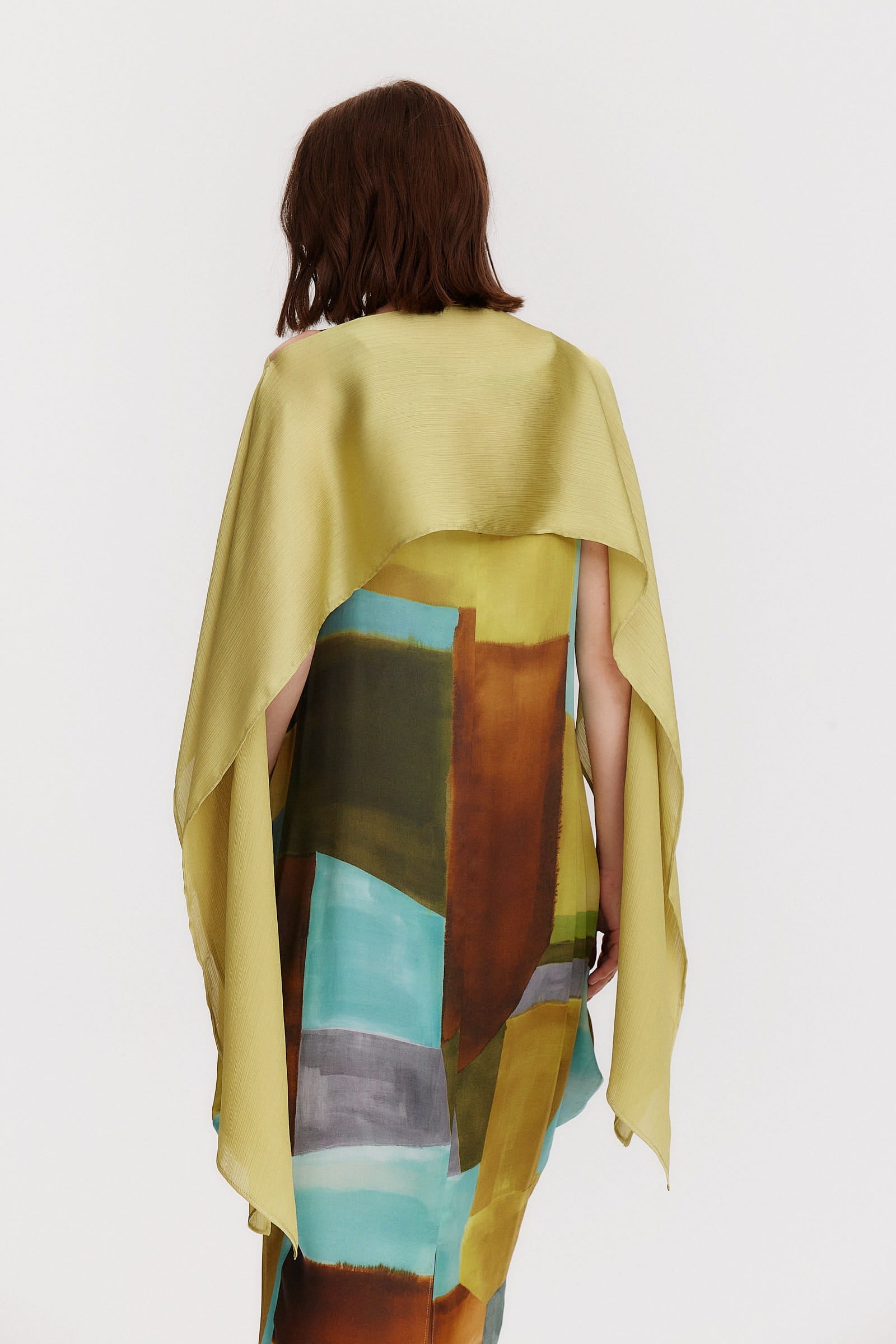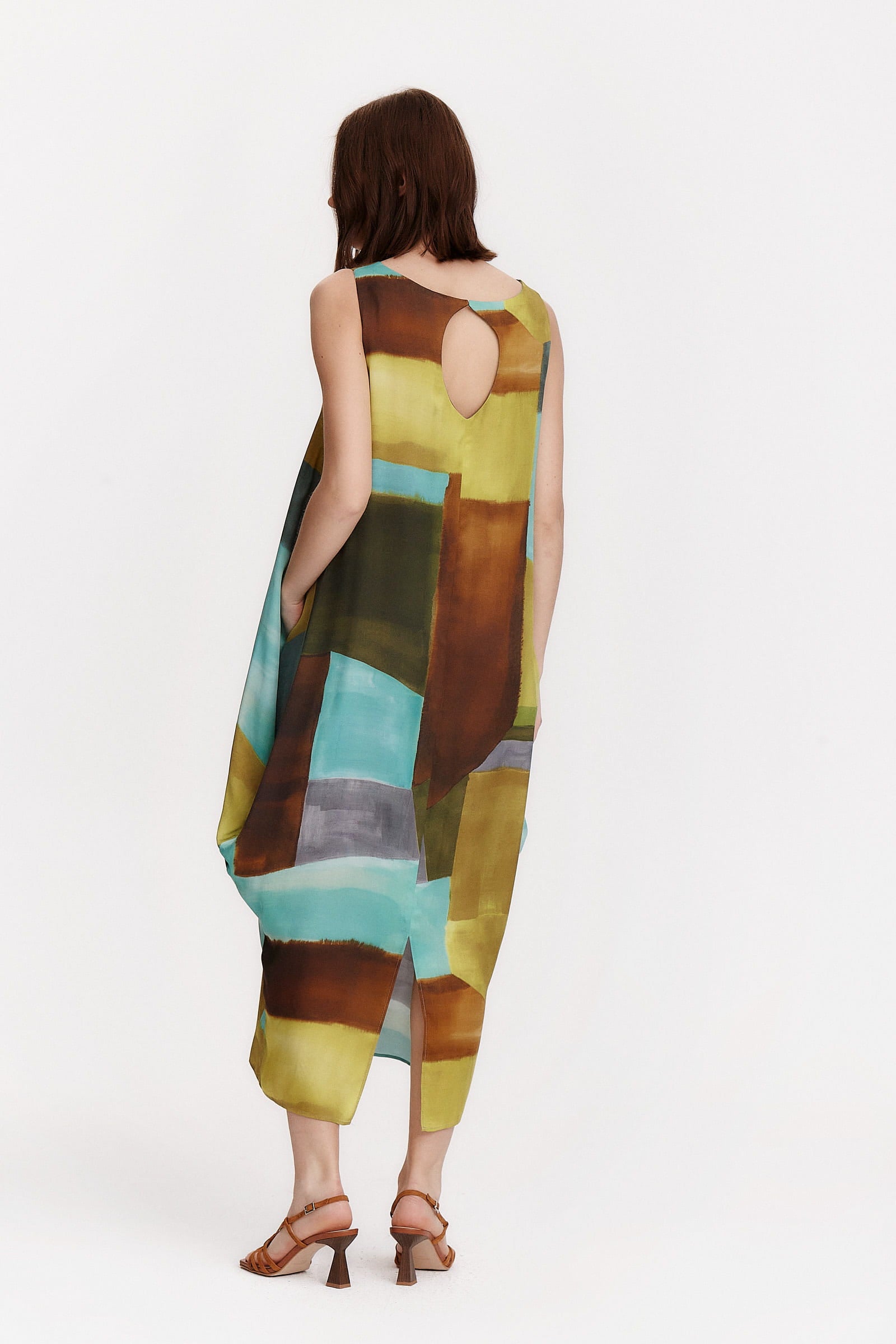 Descubra Alma, um vestido midi solto com um estilo único e confortável, perfeito para se adaptar à sua figura. Com uma combinação de cores frescas, como lima, azul e castanho, e um elegante estampado geométrico, este vestido é uma verdadeira joia.