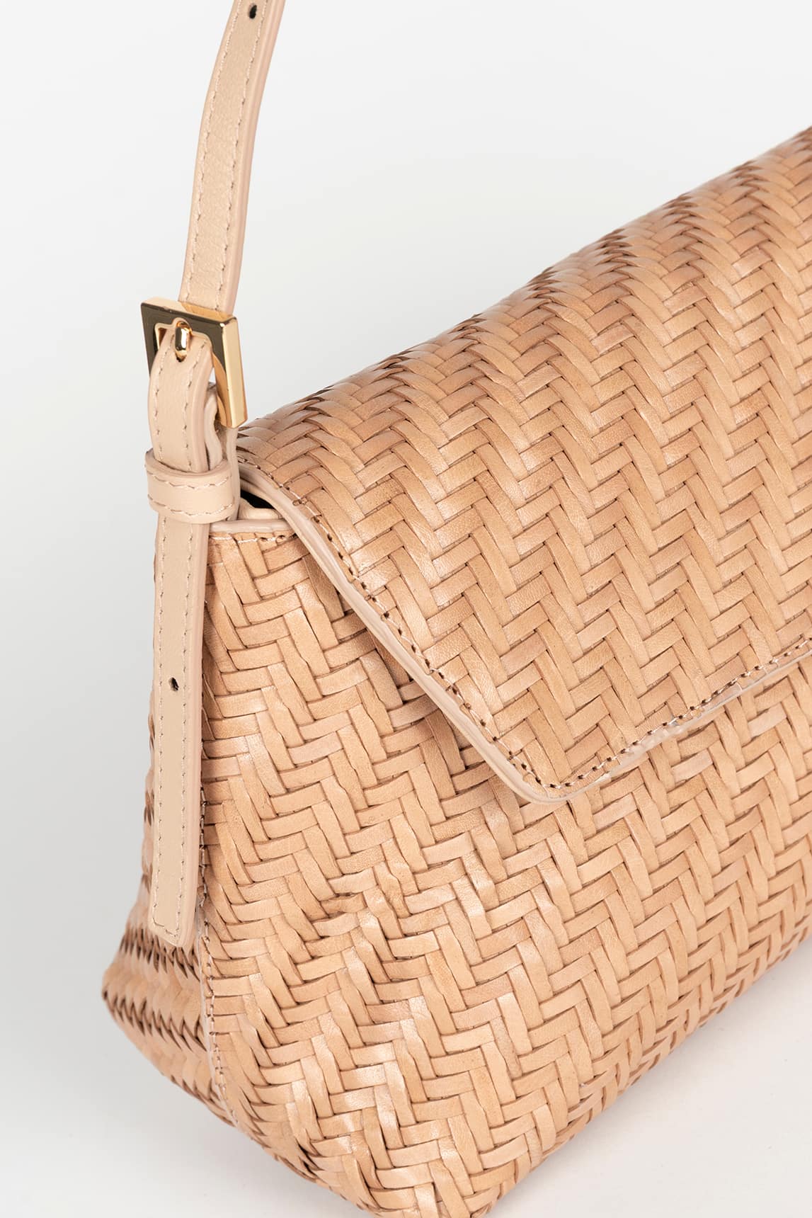 Este bolso compacto presenta una silueta rectangular definida con solapa frontal que estructura el diseño y aporta equilibrio visual. La superficie está completamente trabajada en trenzado fino en patrón espiga, creando una textura uniforme y elegante que añade profundidad. Incorpora asa corta ajustable con herraje metálico en tono dorado, manteniendo una estética limpia y funcional. Su formato ligero lo convierte en una opción práctica para llevar lo esencial con comodidad.